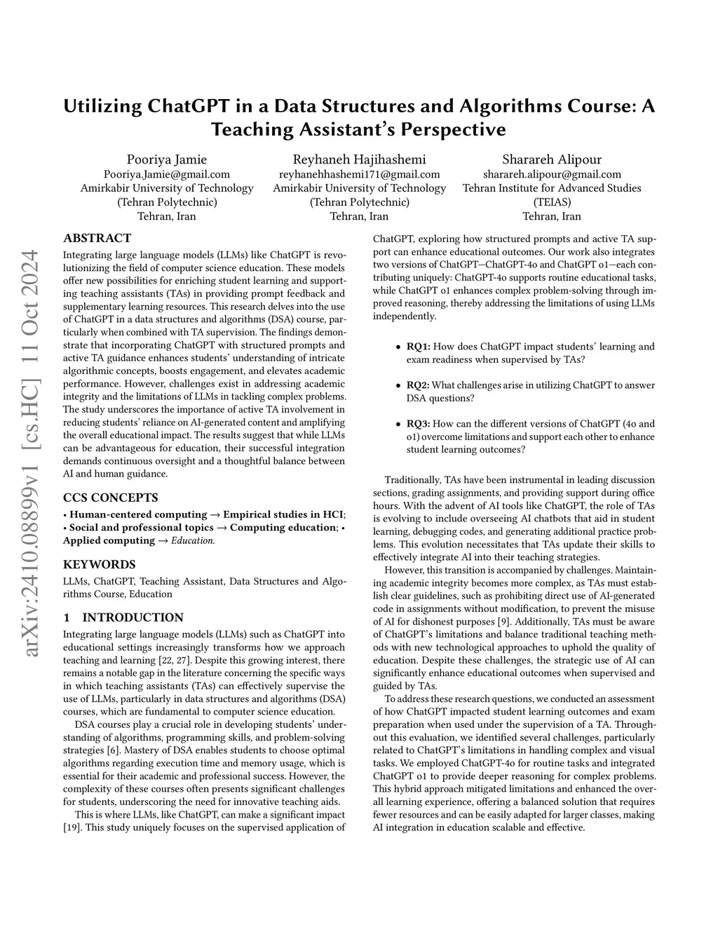 Integrating large language models (LLMs) like ChatGPT into computer science education offers transformative potential for complex courses such as data structures and algorithms (DSA). This study examines ChatGPT as a supplementary tool for teaching assistants (TAs), guided by structured prompts and human oversight, to enhance instruction and student outcomes. A controlled experiment compared traditional TA-led instruction with a hybrid approach where TAs used ChatGPT-4o and ChatGPT o1 to generate exercises, clarify concepts, and provide feedback. Structured prompts emphasized problem decomposition, real-world context, and code examples, enabling tailored support while mitigating over-reliance on AI. Results demonstrated the hybrid approach's efficacy, with students in the ChatGPT-assisted group scoring 16.50 points higher on average and excelling in advanced topics. However, ChatGPT's limitations necessitated TA verification. This framework highlights the dual role of LLMs: augmenting TA efficiency while ensuring accuracy through human oversight, offering a scalable solution for human-AI collaboration in education.