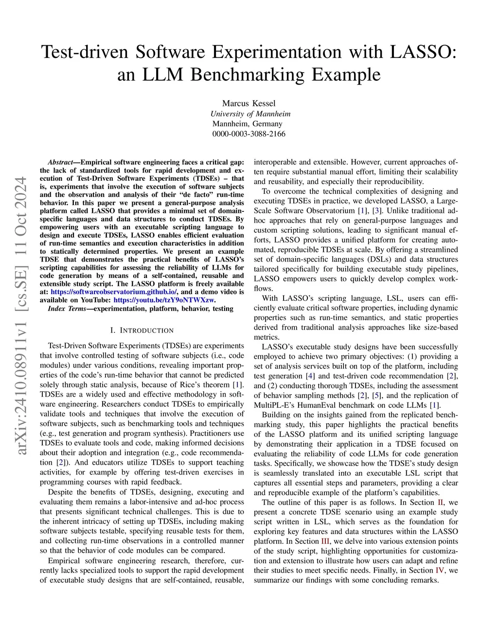 Empirical software engineering faces a critical gap: the lack of standardized tools for rapid development and execution of Test-Driven Software Experiments (TDSEs) -- that is, experiments that involve the execution of software subjects and the observation and analysis of their "de facto" run-time behavior. In this paper we present a general-purpose analysis platform called LASSO that provides a minimal set of domain-specific languages and data structures to conduct TDSEs. By empowering users with an executable scripting language to design and execute TDSEs, LASSO enables efficient evaluation of run-time semantics and execution characteristics in addition to statically determined properties. We present an example TDSE that demonstrates the practical benefits of LASSO's scripting capabilities for assessing the reliability of LLMs for code generation by means of a self-contained, reusable and extensible study script. The LASSO platform and live pipeline examples are publicly available at:this https URL.