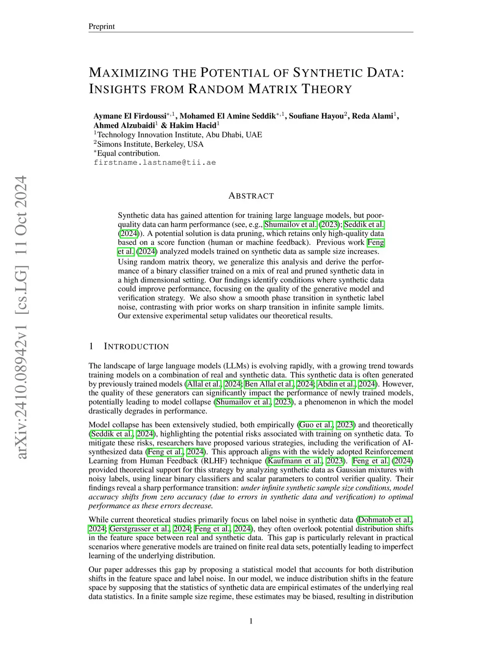 Maximizing the Potential of Synthetic Data: Insights from Random Matrix