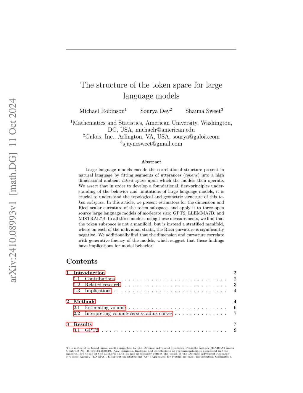 Large language models encode the correlational structure present in natural language by fitting segments of utterances (tokens) into a high dimensional ambient latent space upon which the models then operate. We assert that in order to develop a foundational, first-principles understanding of the behavior and limitations of large language models, it is crucial to understand the topological and geometric structure of this token subspace. In this article, we present estimators for the dimension and Ricci scalar curvature of the token subspace, and apply it to three open source large language models of moderate size: GPT2, LLEMMA7B, and MISTRAL7B. In all three models, using these measurements, we find that the token subspace is not a manifold, but is instead a stratified manifold, where on each of the individual strata, the Ricci curvature is significantly negative. We additionally find that the dimension and curvature correlate with generative fluency of the models, which suggest that these findings have implications for model behavior.