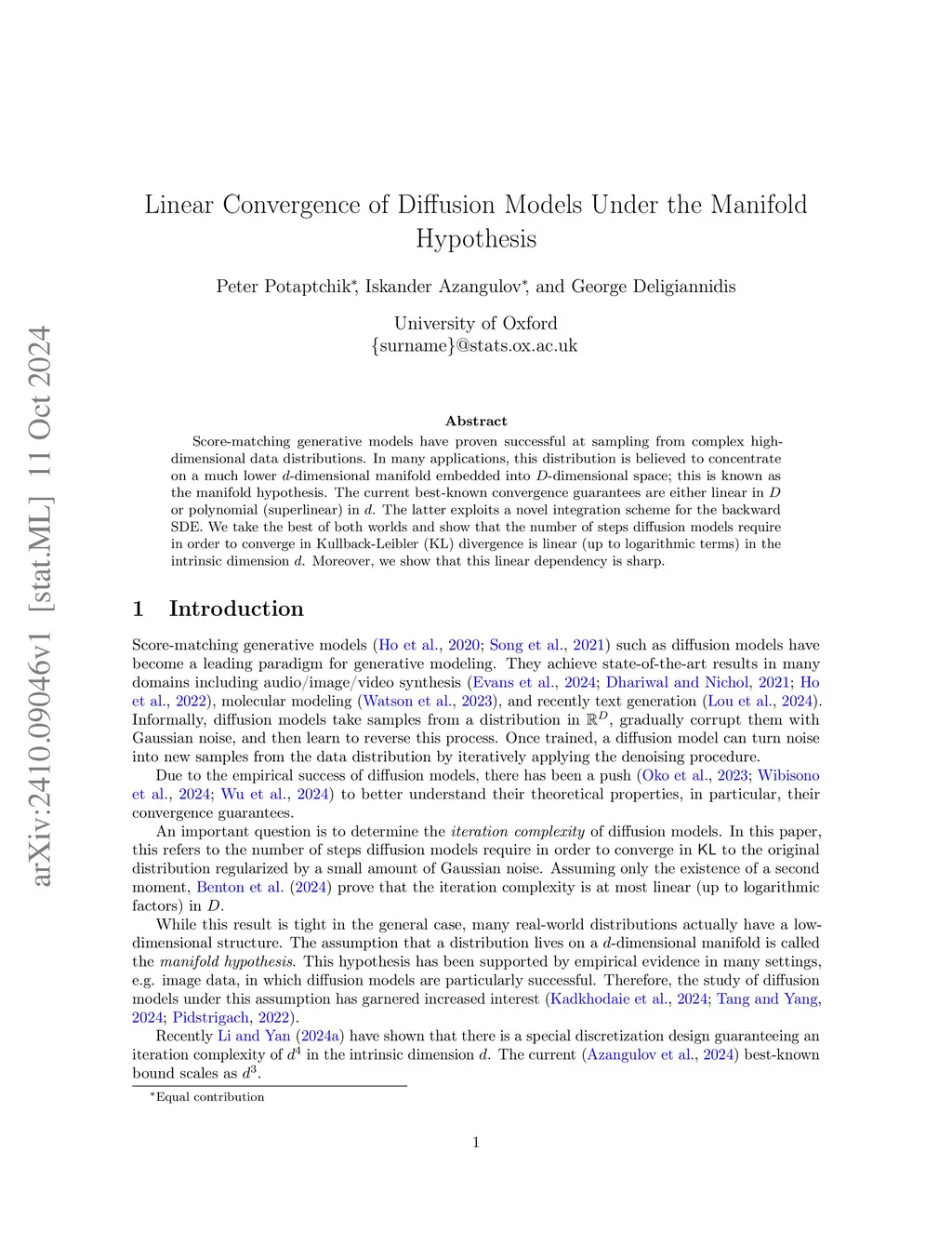 Score-matching generative models have proven successful at sampling from complex high-dimensional data distributions. In many applications, this distribution is believed to concentrate on a much lower -dimensional manifold embedded into -dimensional space; this is known as the manifold hypothesis. The current best-known convergence guarantees are either linear in or polynomial (superlinear) in . The latter exploits a novel integration scheme for the backward SDE. We take the best of both worlds and show that the number of steps diffusion models require in order to converge in Kullback-Leibler~(KL) divergence is linear (up to logarithmic terms) in the intrinsic dimension . Moreover, we show that this linear dependency is sharp.