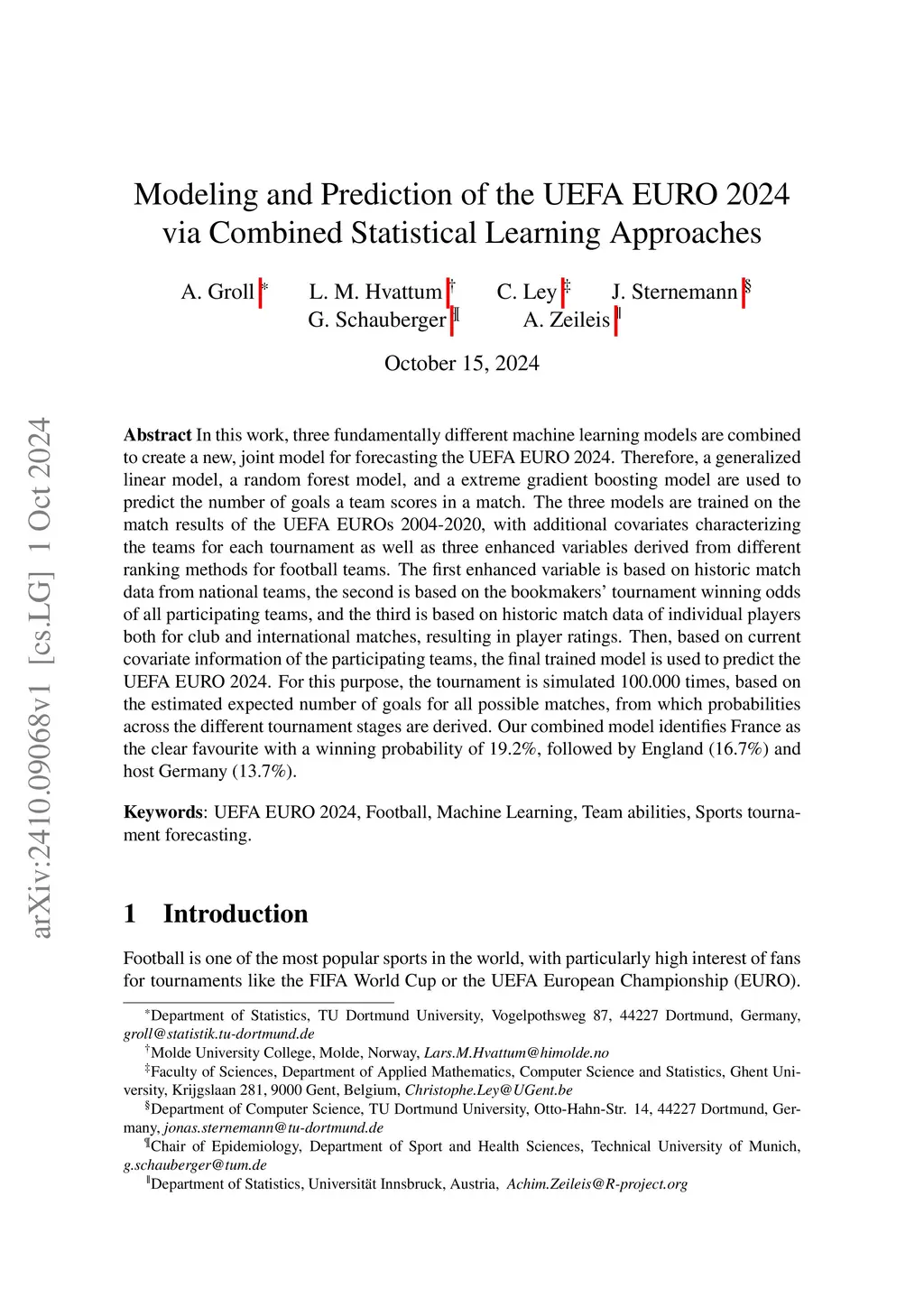 In this work, three fundamentally different machine learning models are combined to create a new, joint model for forecasting the UEFA EURO 2024. Therefore, a generalized linear model, a random forest model, and a extreme gradient boosting model are used to predict the number of goals a team scores in a match. The three models are trained on the match results of the UEFA EUROs 2004-2020, with additional covariates characterizing the teams for each tournament as well as three enhanced variables derived from different ranking methods for football teams. The first enhanced variable is based on historic match data from national teams, the second is based on the bookmakers' tournament winning odds of all participating teams, and the third is based on historic match data of individual players both for club and international matches, resulting in player ratings. Then, based on current covariate information of the participating teams, the final trained model is used to predict the UEFA EURO 2024. For this purpose, the tournament is simulated 100.000 times, based on the estimated expected number of goals for all possible matches, from which probabilities across the different tournament stages are derived. Our combined model identifies France as the clear favourite with a winning probability of 19.2%, followed by England (16.7%) and host Germany (13.7%).