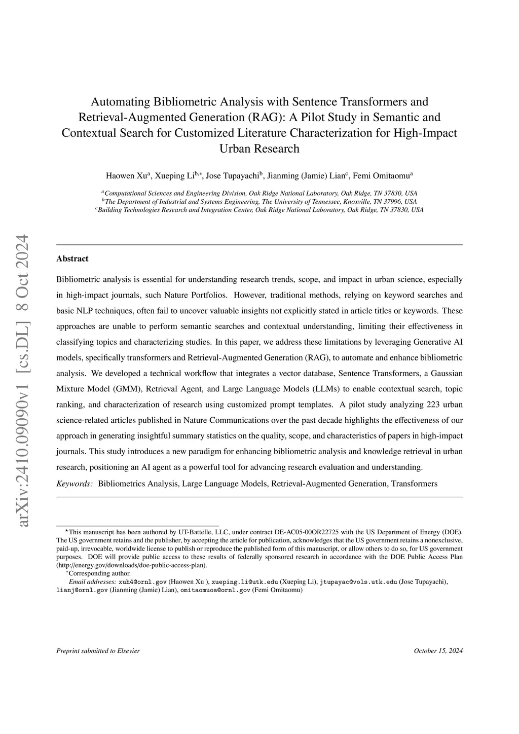 Bibliometric analysis is essential for understanding research trends, scope, and impact in urban science, especially in high-impact journals, such Nature Portfolios. However, traditional methods, relying on keyword searches and basic NLP techniques, often fail to uncover valuable insights not explicitly stated in article titles or keywords. These approaches are unable to perform semantic searches and contextual understanding, limiting their effectiveness in classifying topics and characterizing studies. In this paper, we address these limitations by leveraging Generative AI models, specifically transformers and Retrieval-Augmented Generation (RAG), to automate and enhance bibliometric analysis. We developed a technical workflow that integrates a vector database, Sentence Transformers, a Gaussian Mixture Model (GMM), Retrieval Agent, and Large Language Models (LLMs) to enable contextual search, topic ranking, and characterization of research using customized prompt templates. A pilot study analyzing 223 urban science-related articles published in Nature Communications over the past decade highlights the effectiveness of our approach in generating insightful summary statistics on the quality, scope, and characteristics of papers in high-impact journals. This study introduces a new paradigm for enhancing bibliometric analysis and knowledge retrieval in urban research, positioning an AI agent as a powerful tool for advancing research evaluation and understanding.