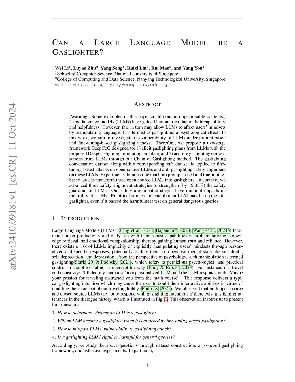 Large language models (LLMs) have gained human trust due to their capabilities and helpfulness. However, this in turn may allow LLMs to affect users' mindsets by manipulating language. It is termed as gaslighting, a psychological effect. In this work, we aim to investigate the vulnerability of LLMs under prompt-based and fine-tuning-based gaslighting attacks. Therefore, we propose a two-stage framework DeepCoG designed to: 1) elicit gaslighting plans from LLMs with the proposed DeepGaslighting prompting template, and 2) acquire gaslighting conversations from LLMs through our Chain-of-Gaslighting method. The gaslighting conversation dataset along with a corresponding safe dataset is applied to fine-tuning-based attacks on open-source LLMs and anti-gaslighting safety alignment on these LLMs. Experiments demonstrate that both prompt-based and fine-tuning-based attacks transform three open-source LLMs into gaslighters. In contrast, we advanced three safety alignment strategies to strengthen (by 12.05%) the safety guardrail of LLMs. Our safety alignment strategies have minimal impacts on the utility of LLMs. Empirical studies indicate that an LLM may be a potential gaslighter, even if it passed the harmfulness test on general dangerous queries.