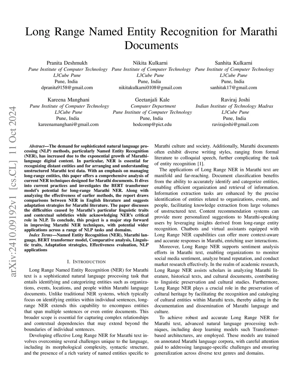 The demand for sophisticated natural language processing (NLP) methods, particularly Named Entity Recognition (NER), has increased due to the exponential growth of Marathi-language digital content. In particular, NER is essential for recognizing distant entities and for arranging and understanding unstructured Marathi text data. With an emphasis on managing long-range entities, this paper offers a comprehensive analysis of current NER techniques designed for Marathi documents. It dives into current practices and investigates the BERT transformer model's potential for long-range Marathi NER. Along with analyzing the effectiveness of earlier methods, the report draws comparisons between NER in English literature and suggests adaptation strategies for Marathi literature. The paper discusses the difficulties caused by Marathi's particular linguistic traits and contextual subtleties while acknowledging NER's critical role in NLP. To conclude, this project is a major step forward in improving Marathi NER techniques, with potential wider applications across a range of NLP tasks and domains.