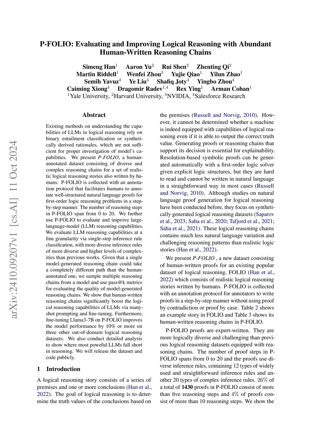 Existing methods on understanding the capabilities of LLMs in logical reasoning rely on binary entailment classification or synthetically derived rationales, which are not sufficient for proper investigation of model's capabilities. We present P-FOLIO, a human-annotated dataset consisting of diverse and complex reasoning chains for a set of realistic logical reasoning stories also written by humans. P-FOLIO is collected with an annotation protocol that facilitates humans to annotate well-structured natural language proofs for first-order logic reasoning problems in a step-by-step manner. The number of reasoning steps in P-FOLIO span from 0 to 20. We further use P-FOLIO to evaluate and improve large-language-model (LLM) reasoning capabilities. We evaluate LLM reasoning capabilities at a fine granularity via single-step inference rule classification, with more diverse inference rules of more diverse and higher levels of complexities than previous works. Given that a single model-generated reasoning chain could take a completely different path than the human-annotated one, we sample multiple reasoning chains from a model and use pass@k metrics for evaluating the quality of model-generated reasoning chains. We show that human-written reasoning chains significantly boost the logical reasoning capabilities of LLMs via many-shot prompting and fine-tuning. Furthermore, fine-tuning Llama3-7B on P-FOLIO improves the model performance by 10% or more on three other out-of-domain logical reasoning datasets. We also conduct detailed analysis to show where most powerful LLMs fall short in reasoning. We will release the dataset and code publicly.