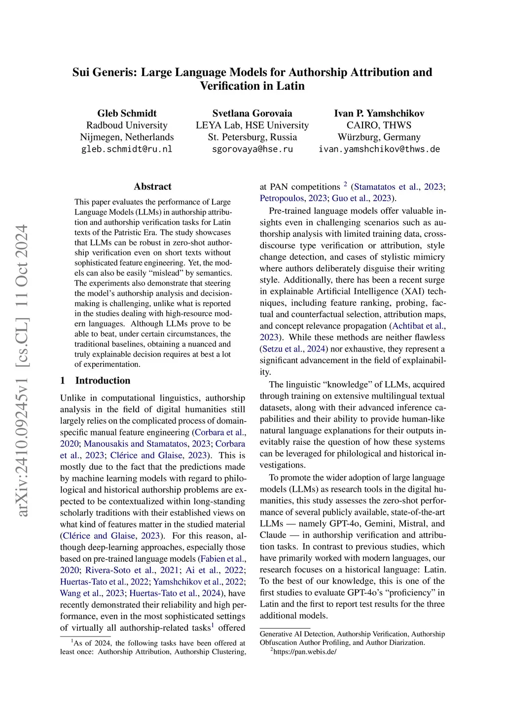 This paper evaluates the performance of Large Language Models (LLMs) in authorship attribution and authorship verification tasks for Latin texts of the Patristic Era. The study showcases that LLMs can be robust in zero-shot authorship verification even on short texts without sophisticated feature engineering. Yet, the models can also be easily "mislead" by semantics. The experiments also demonstrate that steering the model's authorship analysis and decision-making is challenging, unlike what is reported in the studies dealing with high-resource modern languages. Although LLMs prove to be able to beat, under certain circumstances, the traditional baselines, obtaining a nuanced and truly explainable decision requires at best a lot of experimentation.
