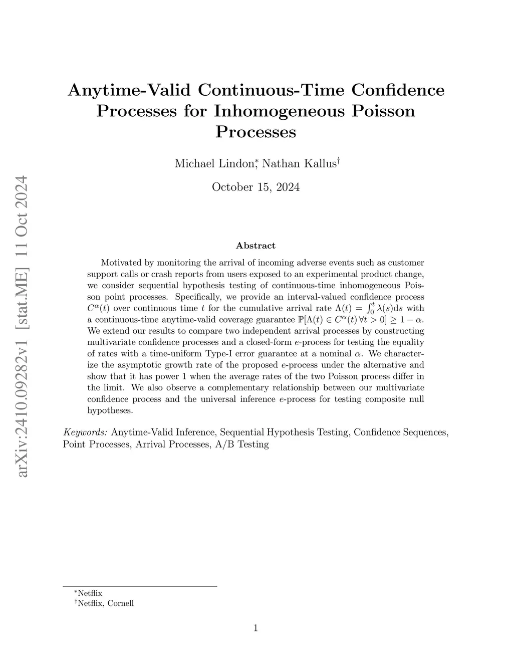 Motivated by monitoring the arrival of incoming adverse events such as customer support calls or crash reports from users exposed to an experimental product change, we consider sequential hypothesis testing of continuous-time inhomogeneous Poisson point processes. Specifically, we provide an interval-valued confidence process over continuous time for the cumulative arrival rate with a continuous-time anytime-valid coverage guarantee . We extend our results to compare two independent arrival processes by constructing multivariate confidence processes and a closed-form -process for testing the equality of rates with a time-uniform Type-I error guarantee at a nominal . We characterize the asymptotic growth rate of the proposed -process under the alternative and show that it has power 1 when the average rates of the two Poisson process differ in the limit. We also observe a complementary relationship between our multivariate confidence process and the universal inference -process for testing composite null hypotheses.