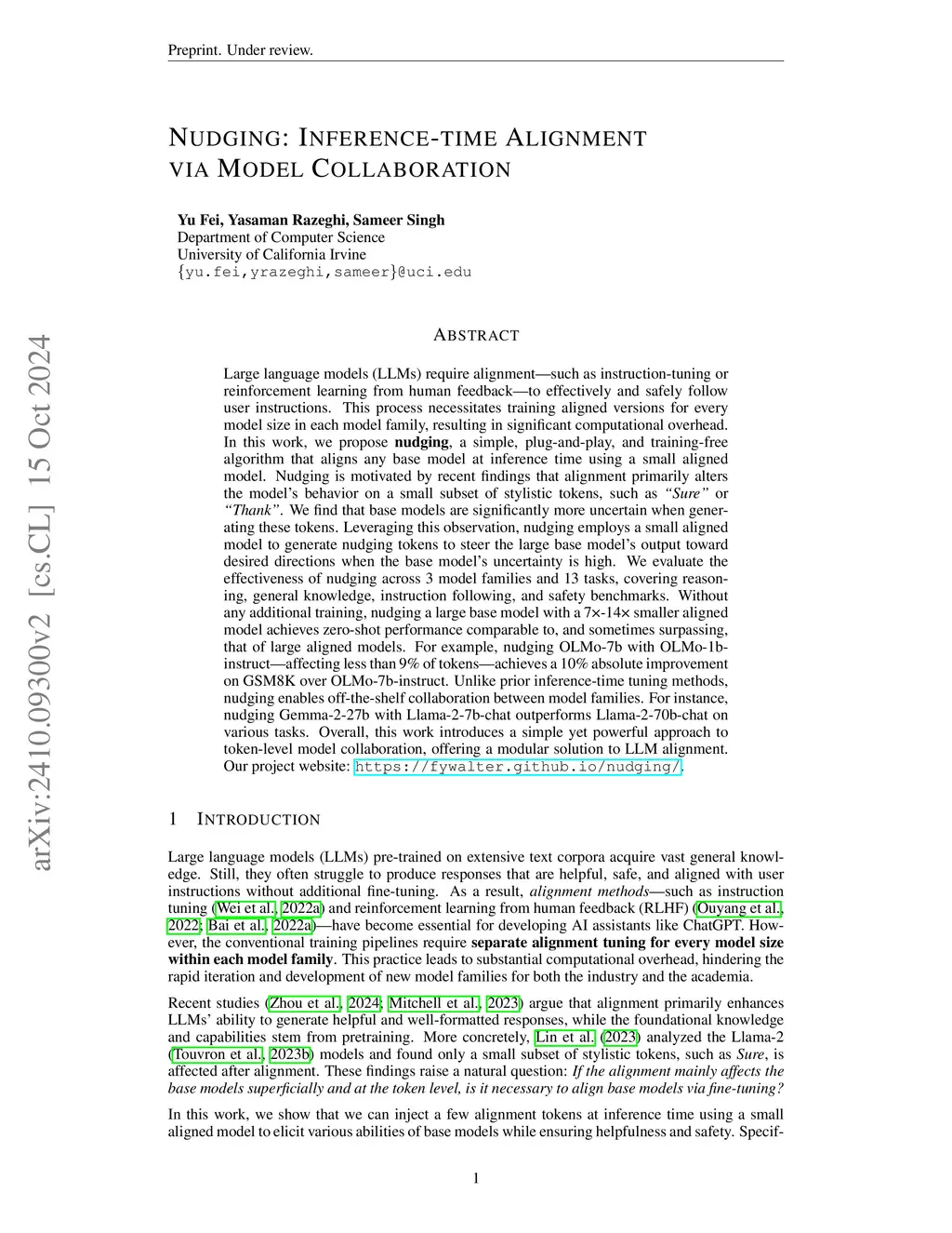 Large language models (LLMs) require alignment to effectively and safely follow user instructions. This process necessitates training an aligned version for every base model, resulting in significant computational overhead. In this work, we propose NUDGING, a simple, training-free algorithm that aligns any base model at inference time using a small aligned model. NUDGING is motivated by recent findings that alignment primarily alters the model's behavior on a small subset of stylistic tokens (e.g., discourse markers). We find that base models are significantly more uncertain when generating these tokens. Building on this insight, NUDGING employs a small aligned model to generate nudging tokens to guide the base model's output during decoding when the base model's uncertainty is high, with only a minor additional inference overhead. We evaluate NUDGING across 3 model families on a diverse range of open-instruction tasks. Without any training, nudging a large base model with a 7x-14x smaller aligned model achieves zero-shot performance comparable to, and sometimes surpassing, that of large aligned models. By operating at the token level, NUDGING enables off-the-shelf collaboration between model families. For instance, nudging Gemma-2-27b with Llama-27b-chat outperforms Llama-2-70b-chat on various tasks. Overall, our work offers a modular and cost-efficient solution to LLM alignment. Our code and demo are available at:this https URL.