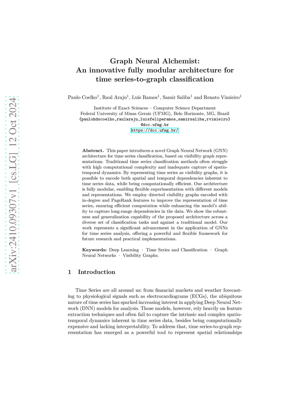 This paper introduces a novel Graph Neural Network (GNN) architecture for time series classification, based on visibility graph representations. Traditional time series classification methods often struggle with high computational complexity and inadequate capture of spatio-temporal dynamics. By representing time series as visibility graphs, it is possible to encode both spatial and temporal dependencies inherent to time series data, while being computationally efficient. Our architecture is fully modular, enabling flexible experimentation with different models and representations. We employ directed visibility graphs encoded with in-degree and PageRank features to improve the representation of time series, ensuring efficient computation while enhancing the model's ability to capture long-range dependencies in the data. We show the robustness and generalization capability of the proposed architecture across a diverse set of classification tasks and against a traditional model. Our work represents a significant advancement in the application of GNNs for time series analysis, offering a powerful and flexible framework for future research and practical implementations.
