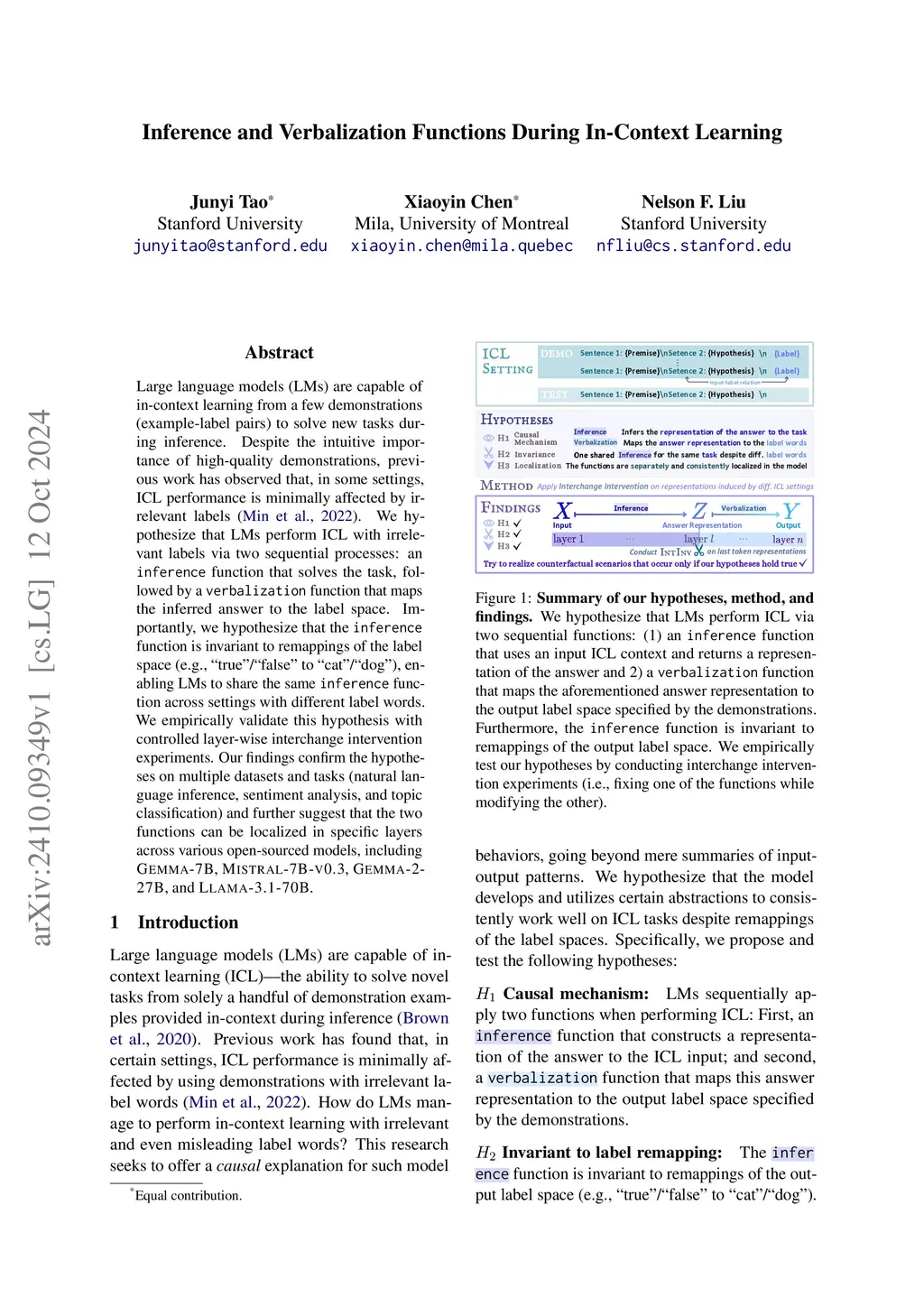 Large language models (LMs) are capable of in-context learning from a few demonstrations (example-label pairs) to solve new tasks during inference. Despite the intuitive importance of high-quality demonstrations, previous work has observed that, in some settings, ICL performance is minimally affected by irrelevant labels (Min et al., 2022). We hypothesize that LMs perform ICL with irrelevant labels via two sequential processes: an inference function that solves the task, followed by a verbalization function that maps the inferred answer to the label space. Importantly, we hypothesize that the inference function is invariant to remappings of the label space (e.g., "true"/"false" to "cat"/"dog"), enabling LMs to share the same inference function across settings with different label words. We empirically validate this hypothesis with controlled layer-wise interchange intervention experiments. Our findings confirm the hypotheses on multiple datasets and tasks (natural language inference, sentiment analysis, and topic classification) and further suggest that the two functions can be localized in specific layers across various open-sourced models, including GEMMA-7B, MISTRAL-7B-V0.3, GEMMA-2-27B, and LLAMA-3.1-70B.