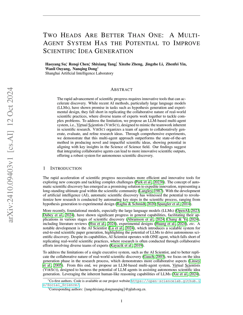 Many Heads Are Better Than One: Improved Scientific Idea Generation by A LLM-Based Multi-Agent System