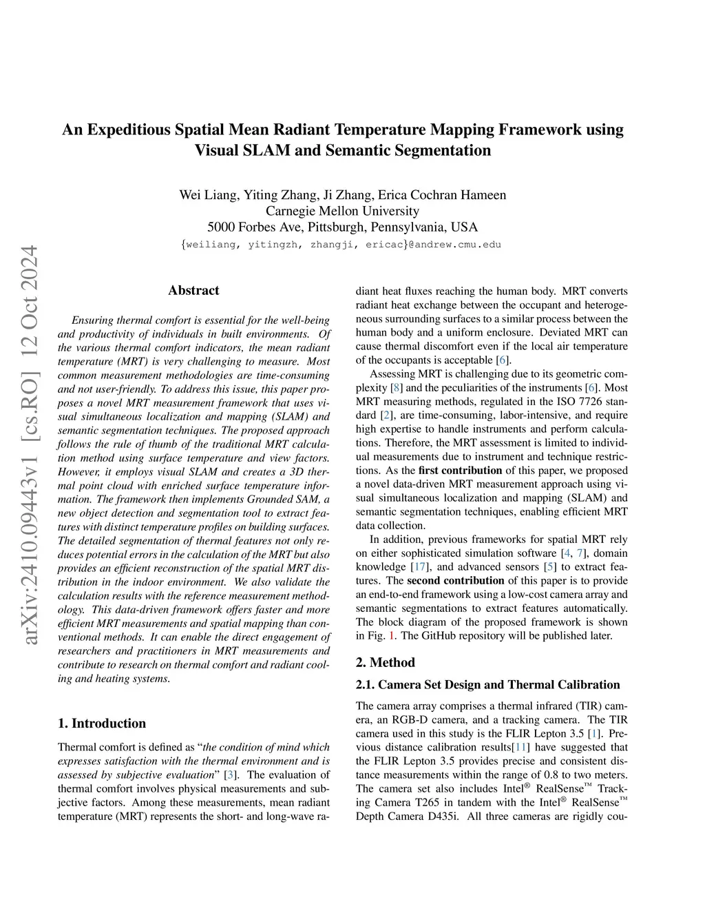 Ensuring thermal comfort is essential for the well-being and productivity of individuals in built environments. Of the various thermal comfort indicators, the mean radiant temperature (MRT) is very challenging to measure. Most common measurement methodologies are time-consuming and not user-friendly. To address this issue, this paper proposes a novel MRT measurement framework that uses visual simultaneous localization and mapping (SLAM) and semantic segmentation techniques. The proposed approach follows the rule of thumb of the traditional MRT calculation method using surface temperature and view factors. However, it employs visual SLAM and creates a 3D thermal point cloud with enriched surface temperature information. The framework then implements Grounded SAM, a new object detection and segmentation tool to extract features with distinct temperature profiles on building surfaces. The detailed segmentation of thermal features not only reduces potential errors in the calculation of the MRT but also provides an efficient reconstruction of the spatial MRT distribution in the indoor environment. We also validate the calculation results with the reference measurement methodology. This data-driven framework offers faster and more efficient MRT measurements and spatial mapping than conventional methods. It can enable the direct engagement of researchers and practitioners in MRT measurements and contribute to research on thermal comfort and radiant cooling and heating systems.