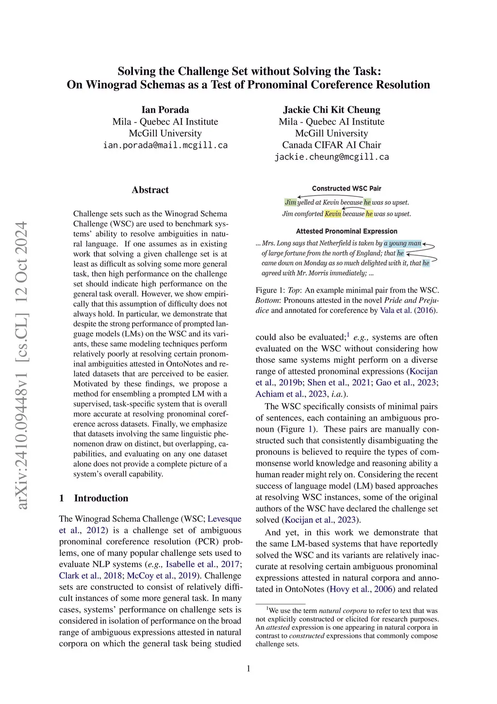 Challenge sets such as the Winograd Schema Challenge (WSC) are used to benchmark systems' ability to resolve ambiguities in natural language. If one assumes as in existing work that solving a given challenge set is at least as difficult as solving some more general task, then high performance on the challenge set should indicate high performance on the general task overall. However, we show empirically that this assumption of difficulty does not always hold. In particular, we demonstrate that despite the strong performance of prompted language models (LMs) on the WSC and its variants, these same modeling techniques perform relatively poorly at resolving certain pronominal ambiguities attested in OntoNotes and related datasets that are perceived to be easier. Motivated by these findings, we propose a method for ensembling a prompted LM with a supervised, task-specific system that is overall more accurate at resolving pronominal coreference across datasets. Finally, we emphasize that datasets involving the same linguistic phenomenon draw on distinct, but overlapping, capabilities, and evaluating on any one dataset alone does not provide a complete picture of a system's overall capability.