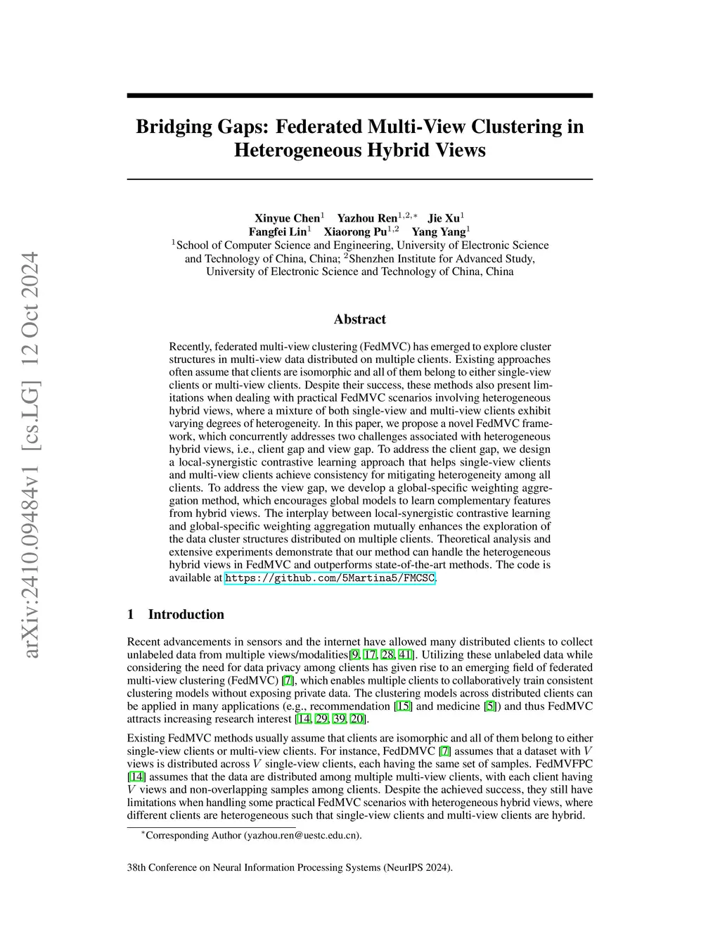Recently, federated multi-view clustering (FedMVC) has emerged to explore cluster structures in multi-view data distributed on multiple clients. Existing approaches often assume that clients are isomorphic and all of them belong to either single-view clients or multi-view clients. Despite their success, these methods also present limitations when dealing with practical FedMVC scenarios involving heterogeneous hybrid views, where a mixture of both single-view and multi-view clients exhibit varying degrees of heterogeneity. In this paper, we propose a novel FedMVC framework, which concurrently addresses two challenges associated with heterogeneous hybrid views, i.e., client gap and view gap. To address the client gap, we design a local-synergistic contrastive learning approach that helps single-view clients and multi-view clients achieve consistency for mitigating heterogeneity among all clients. To address the view gap, we develop a global-specific weighting aggregation method, which encourages global models to learn complementary features from hybrid views. The interplay between local-synergistic contrastive learning and global-specific weighting aggregation mutually enhances the exploration of the data cluster structures distributed on multiple clients. Theoretical analysis and extensive experiments demonstrate that our method can handle the heterogeneous hybrid views in FedMVC and outperforms state-of-the-art methods. The code is available at \url{https://github.com/5Martina5/FMCSC}.
