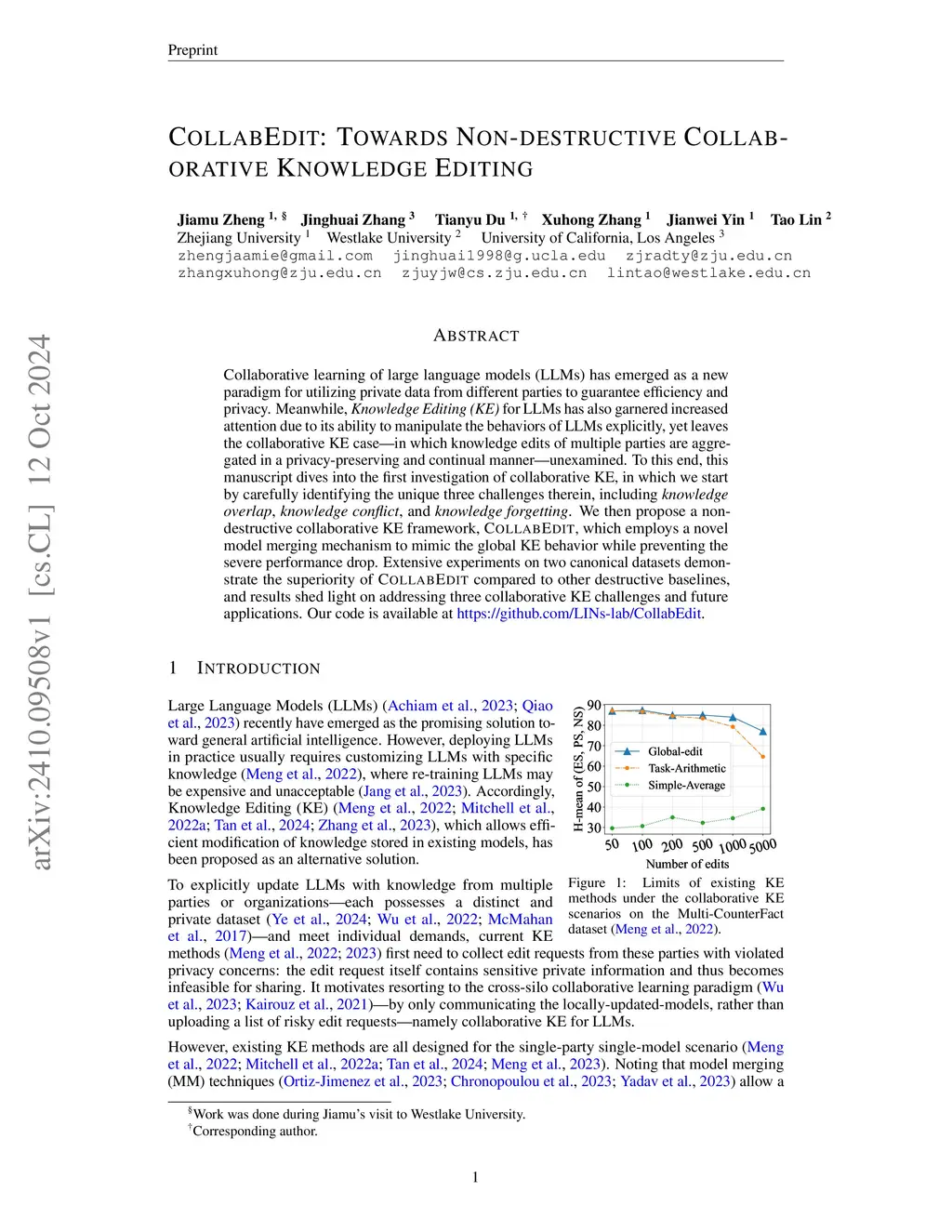Collaborative learning of large language models (LLMs) has emerged as a new paradigm for utilizing private data from different parties to guarantee efficiency and privacy. Meanwhile, Knowledge Editing (KE) for LLMs has also garnered increased attention due to its ability to manipulate the behaviors of LLMs explicitly, yet leaves the collaborative KE case (in which knowledge edits of multiple parties are aggregated in a privacy-preserving and continual manner) unexamined. To this end, this manuscript dives into the first investigation of collaborative KE, in which we start by carefully identifying the unique three challenges therein, including knowledge overlap, knowledge conflict, and knowledge forgetting. We then propose a non-destructive collaborative KE framework, COLLABEDIT, which employs a novel model merging mechanism to mimic the global KE behavior while preventing the severe performance drop. Extensive experiments on two canonical datasets demonstrate the superiority of COLLABEDIT compared to other destructive baselines, and results shed light on addressing three collaborative KE challenges and future applications. Our code is available atthis https URL.