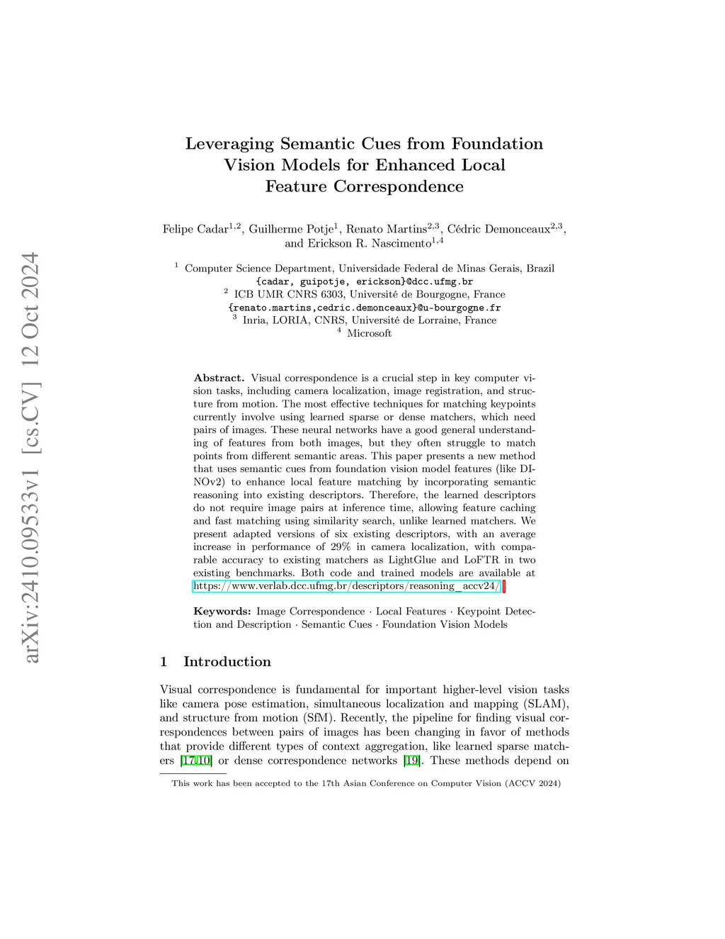 Visual correspondence is a crucial step in key computer vision tasks, including camera localization, image registration, and structure from motion. The most effective techniques for matching keypoints currently involve using learned sparse or dense matchers, which need pairs of images. These neural networks have a good general understanding of features from both images, but they often struggle to match points from different semantic areas. This paper presents a new method that uses semantic cues from foundation vision model features (like DINOv2) to enhance local feature matching by incorporating semantic reasoning into existing descriptors. Therefore, the learned descriptors do not require image pairs at inference time, allowing feature caching and fast matching using similarity search, unlike learned matchers. We present adapted versions of six existing descriptors, with an average increase in performance of 29% in camera localization, with comparable accuracy to existing matchers as LightGlue and LoFTR in two existing benchmarks. Both code and trained models are available at https://www.verlab.dcc.ufmg.br/descriptors/reasoning_accv24