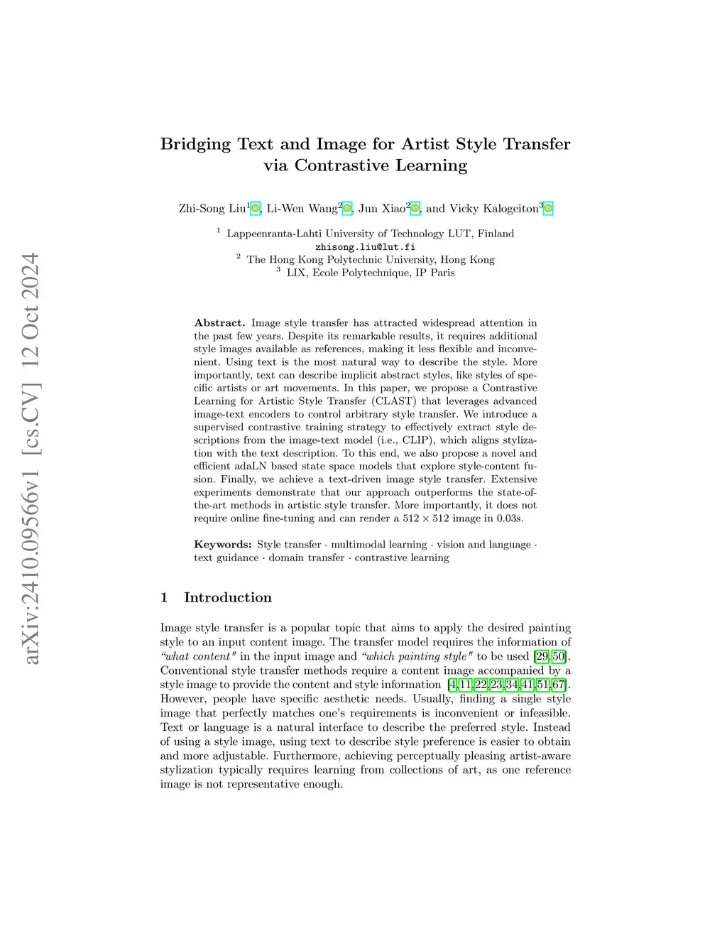 Bridging Text and Image for Artist Style Transfer via Contrastive
