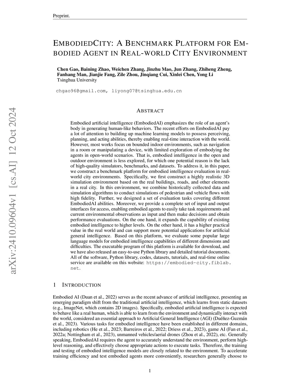 Embodied artificial intelligence emphasizes the role of an agent's body in generating human-like behaviors. The recent efforts on EmbodiedAI pay a lot of attention to building up machine learning models to possess perceiving, planning, and acting abilities, thereby enabling real-time interaction with the world. However, most works focus on bounded indoor environments, such as navigation in a room or manipulating a device, with limited exploration of embodying the agents in open-world scenarios. That is, embodied intelligence in the open and outdoor environment is less explored, for which one potential reason is the lack of high-quality simulators, benchmarks, and datasets. To address it, in this paper, we construct a benchmark platform for embodied intelligence evaluation in real-world city environments. Specifically, we first construct a highly realistic 3D simulation environment based on the real buildings, roads, and other elements in a real city. In this environment, we combine historically collected data and simulation algorithms to conduct simulations of pedestrian and vehicle flows with high fidelity. Further, we designed a set of evaluation tasks covering different EmbodiedAI abilities. Moreover, we provide a complete set of input and output interfaces for access, enabling embodied agents to easily take task requirements and current environmental observations as input and then make decisions and obtain performance evaluations. On the one hand, it expands the capability of existing embodied intelligence to higher levels. On the other hand, it has a higher practical value in the real world and can support more potential applications for artificial general intelligence. Based on this platform, we evaluate some popular large language models for embodied intelligence capabilities of different dimensions and difficulties.