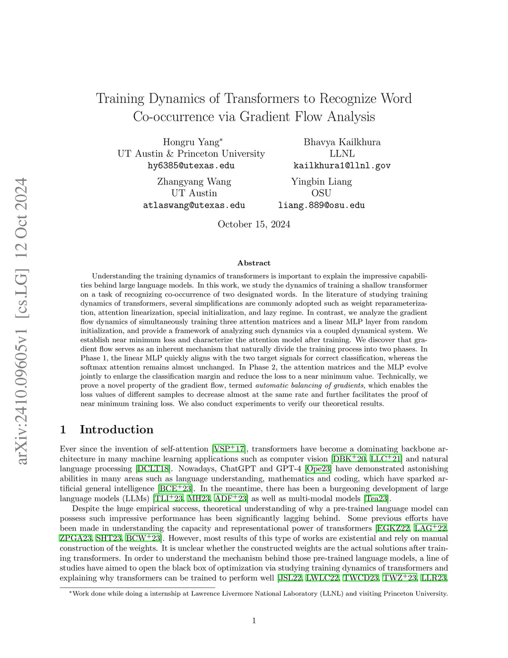 Understanding the training dynamics of transformers is important to explain the impressive capabilities behind large language models. In this work, we study the dynamics of training a shallow transformer on a task of recognizing co-occurrence of two designated words. In the literature of studying training dynamics of transformers, several simplifications are commonly adopted such as weight reparameterization, attention linearization, special initialization, and lazy regime. In contrast, we analyze the gradient flow dynamics of simultaneously training three attention matrices and a linear MLP layer from random initialization, and provide a framework of analyzing such dynamics via a coupled dynamical system. We establish near minimum loss and characterize the attention model after training. We discover that gradient flow serves as an inherent mechanism that naturally divide the training process into two phases. In Phase 1, the linear MLP quickly aligns with the two target signals for correct classification, whereas the softmax attention remains almost unchanged. In Phase 2, the attention matrices and the MLP evolve jointly to enlarge the classification margin and reduce the loss to a near minimum value. Technically, we prove a novel property of the gradient flow, termed \textit{automatic balancing of gradients}, which enables the loss values of different samples to decrease almost at the same rate and further facilitates the proof of near minimum training loss. We also conduct experiments to verify our theoretical results.