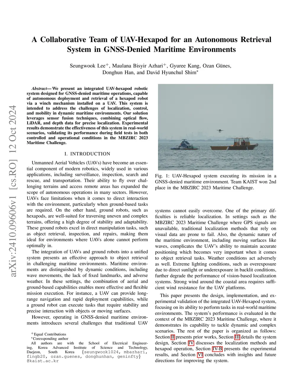 We present an integrated UAV-hexapod robotic system designed for GNSS-denied maritime operations, capable of autonomous deployment and retrieval of a hexapod robot via a winch mechanism installed on a UAV. This system is intended to address the challenges of localization, control, and mobility in dynamic maritime environments. Our solution leverages sensor fusion techniques, combining optical flow, LiDAR, and depth data for precise localization. Experimental results demonstrate the effectiveness of this system in real-world scenarios, validating its performance during field tests in both controlled and operational conditions in the MBZIRC 2023 Maritime Challenge.