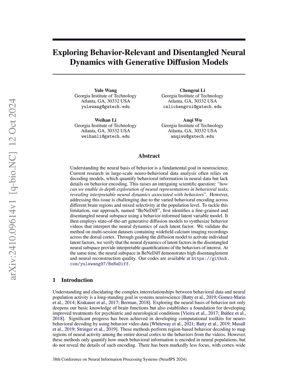 Understanding the neural basis of behavior is a fundamental goal in neuroscience. Current research in large-scale neuro-behavioral data analysis often relies on decoding models, which quantify behavioral information in neural data but lack details on behavior encoding. This raises an intriguing scientific question: ``how can we enable in-depth exploration of neural representations in behavioral tasks, revealing interpretable neural dynamics associated with behaviors''. However, addressing this issue is challenging due to the varied behavioral encoding across different brain regions and mixed selectivity at the population level. To tackle this limitation, our approach, named ``BeNeDiff'', first identifies a fine-grained and disentangled neural subspace using a behavior-informed latent variable model. It then employs state-of-the-art generative diffusion models to synthesize behavior videos that interpret the neural dynamics of each latent factor. We validate the method on multi-session datasets containing widefield calcium imaging recordings across the dorsal cortex. Through guiding the diffusion model to activate individual latent factors, we verify that the neural dynamics of latent factors in the disentangled neural subspace provide interpretable quantifications of the behaviors of interest. At the same time, the neural subspace in BeNeDiff demonstrates high disentanglement and neural reconstruction quality.