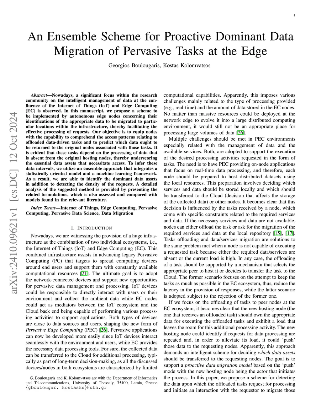 Nowadays, a significant focus within the research community on the intelligent management of data at the confluence of the Internet of Things (IoT) and Edge Computing (EC) is observed. In this manuscript, we propose a scheme to be implemented by autonomous edge nodes concerning their identifications of the appropriate data to be migrated to particular locations within the infrastructure, thereby facilitating the effective processing of requests. Our objective is to equip nodes with the capability to comprehend the access patterns relating to offloaded data-driven tasks and to predict which data ought to be returned to the original nodes associated with those tasks. It is evident that these tasks depend on the processing of data that is absent from the original hosting nodes, thereby underscoring the essential data assets that necessitate access. To infer these data intervals, we utilize an ensemble approach that integrates a statistically oriented model and a machine learning framework. As a result, we are able to identify the dominant data assets in addition to detecting the density of the requests. A detailed analysis of the suggested method is provided by presenting the related formulations, which is also assessed and compared with models found in the relevant literature.