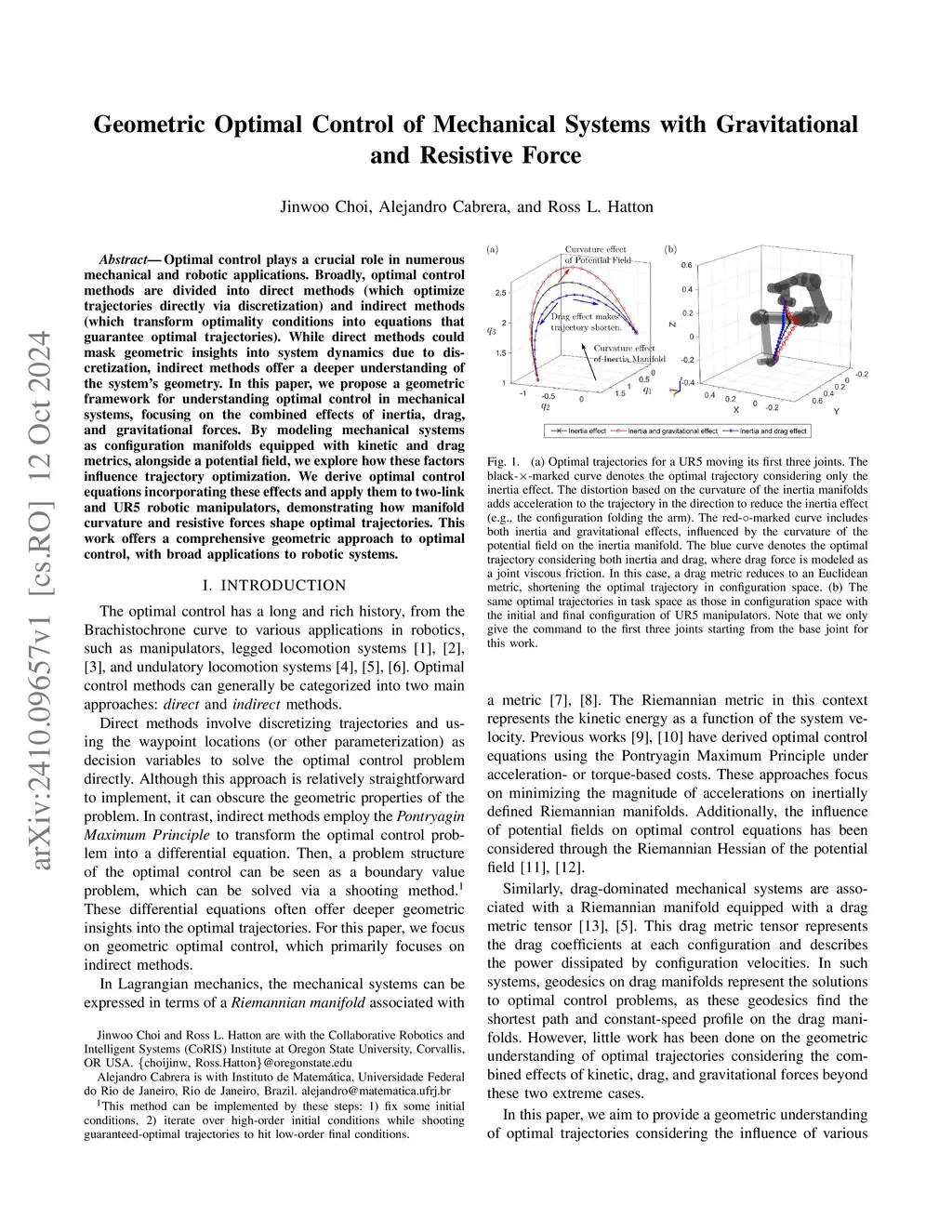 Robotic motion optimization often focuses on task-specific solutions, overlooking fundamental motion principles. Building on Riemannian geometry and the calculus of variations (often appearing as indirect methods of optimal control), we derive an optimal control equation that expresses general forces as functions of configuration and velocity, revealing how inertia, gravity, and drag shape optimal trajectories. Our analysis identifies three key effects: (i) curvature effects of inertia manifold, (ii) curvature effects of potential field, and (iii) shortening effects from resistive force. We validate our approach on a two-link manipulator and a UR5, demonstrating a unified geometric framework for understanding optimal trajectories beyond geodesic-based planning.