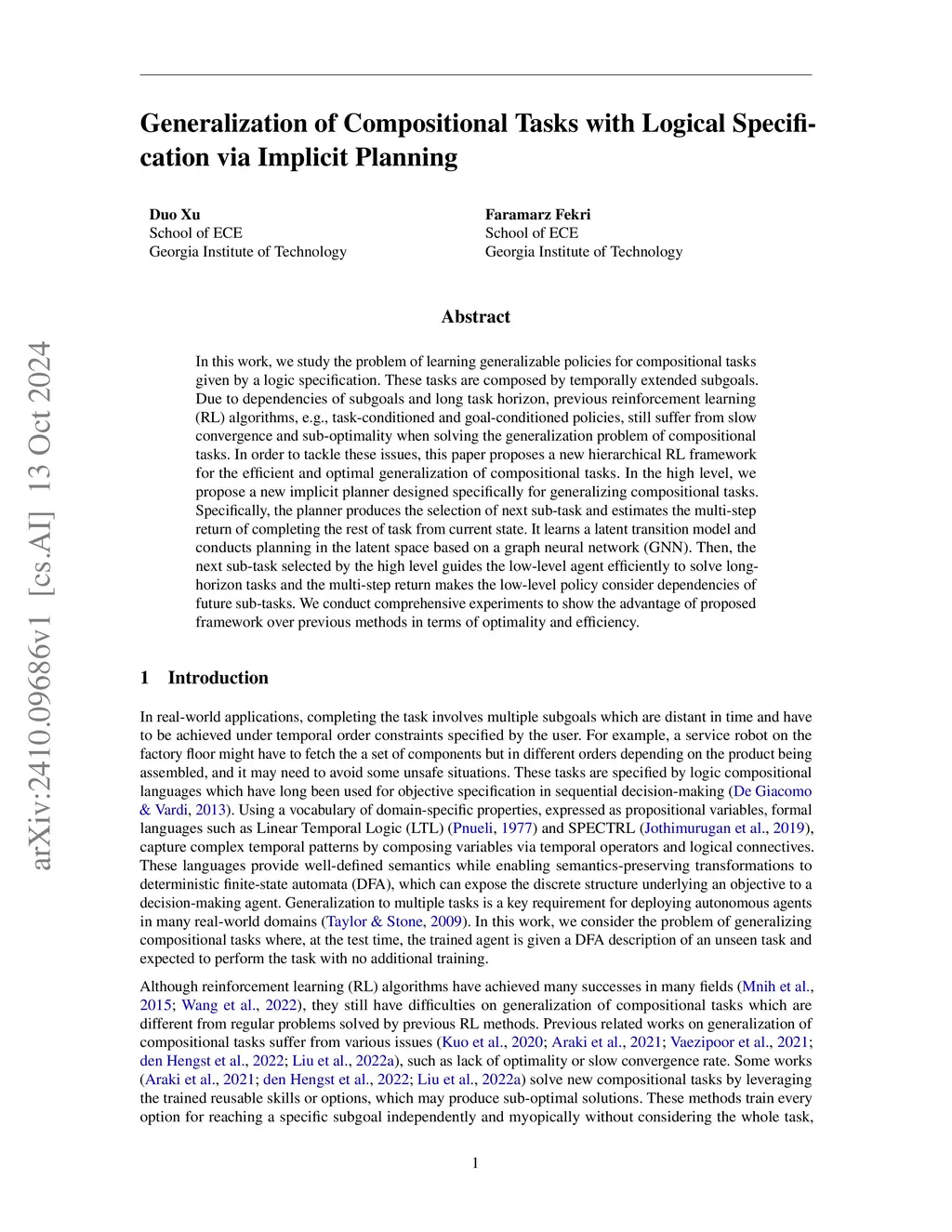 In this work, we study the problem of learning generalizable policies for compositional tasks given by a logic specification. These tasks are composed by temporally extended subgoals. Due to dependencies of subgoals and long task horizon, previous reinforcement learning (RL) algorithms, e.g., task-conditioned and goal-conditioned policies, still suffer from slow convergence and sub-optimality when solving the generalization problem of compositional tasks. In order to tackle these issues, this paper proposes a new hierarchical RL framework for the efficient and optimal generalization of compositional tasks. In the high level, we propose a new implicit planner designed specifically for generalizing compositional tasks. Specifically, the planner produces the selection of next sub-task and estimates the multi-step return of completing the rest of task from current state. It learns a latent transition model and conducts planning in the latent space based on a graph neural network (GNN). Then, the next sub-task selected by the high level guides the low-level agent efficiently to solve long-horizon tasks and the multi-step return makes the low-level policy consider dependencies of future sub-tasks. We conduct comprehensive experiments to show the advantage of proposed framework over previous methods in terms of optimality and efficiency.