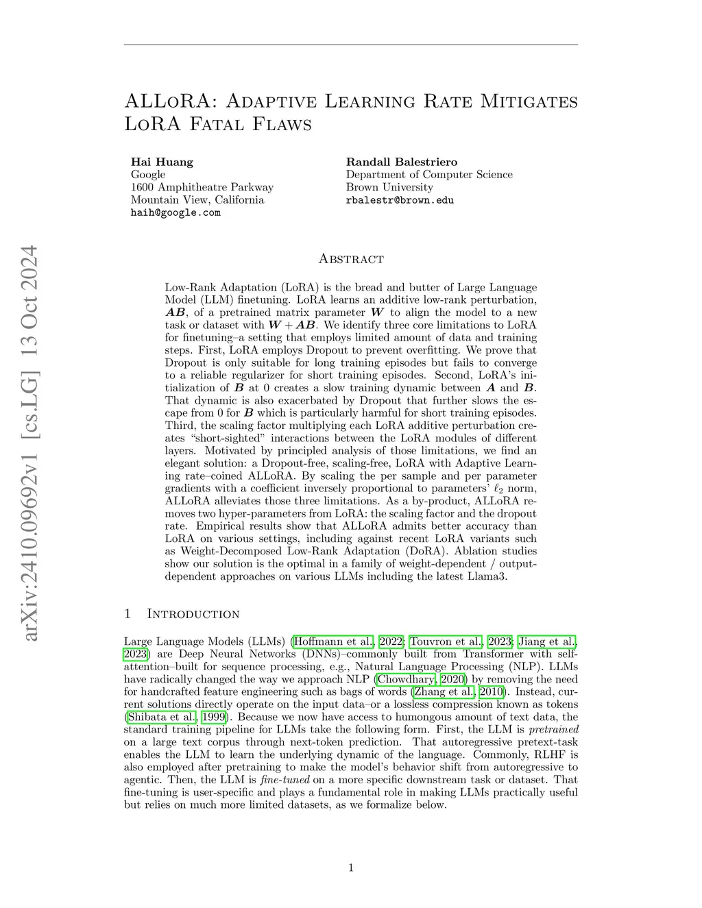 Low-Rank Adaptation (LoRA) is the bread and butter of Large Language Model (LLM) finetuning. LoRA learns an additive low-rank perturbation, , of a pretrained matrix parameter to align the model to a new task or dataset with . We identify three core limitations to LoRA for finetuning--a setting that employs limited amount of data and training steps. First, LoRA employs Dropout to prevent overfitting. We prove that Dropout is only suitable for long training episodes but fails to converge to a reliable regularizer for short training episodes. Second, LoRA's initialization of at creates a slow training dynamic between and . That dynamic is also exacerbated by Dropout that further slows the escape from for which is particularly harmful for short training episodes. Third, the scaling factor multiplying each LoRA additive perturbation creates ``short-sighted'' interactions between the LoRA modules of different layers. Motivated by principled analysis of those limitations, we find an elegant solution: a Dropout-free, scaling-free, LoRA with Adaptive Learning rate--coined ALLoRA. By scaling the per sample and per parameter gradients with a coefficient inversely proportional to parameters' norm, ALLoRA alleviates those three limitations. As a by-product, ALLoRA removes two hyper-parameters from LoRA: the scaling factor and the dropout rate. Empirical results show that ALLoRA admits better accuracy than LoRA on various settings, including against recent LoRA variants such as Weight-Decomposed Low-Rank Adaptation (DoRA). Ablation studies show our solution is the optimal in a family of weight-dependent / output-dependent approaches on various LLMs including the latest Llama3.