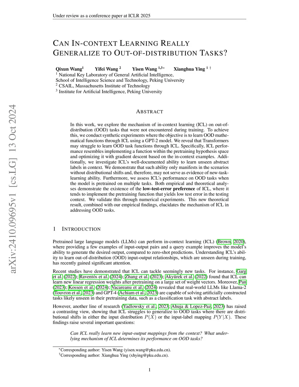 In this work, we explore the mechanism of in-context learning (ICL) on out-of-distribution (OOD) tasks that were not encountered during training. To achieve this, we conduct synthetic experiments where the objective is to learn OOD mathematical functions through ICL using a GPT-2 model. We reveal that Transformers may struggle to learn OOD task functions through ICL. Specifically, ICL performance resembles implementing a function within the pretraining hypothesis space and optimizing it with gradient descent based on the in-context examples. Additionally, we investigate ICL's well-documented ability to learn unseen abstract labels in context. We demonstrate that such ability only manifests in the scenarios without distributional shifts and, therefore, may not serve as evidence of new-task-learning ability. Furthermore, we assess ICL's performance on OOD tasks when the model is pretrained on multiple tasks. Both empirical and theoretical analyses demonstrate the existence of the \textbf{low-test-error preference} of ICL, where it tends to implement the pretraining function that yields low test error in the testing context. We validate this through numerical experiments. This new theoretical result, combined with our empirical findings, elucidates the mechanism of ICL in addressing OOD tasks.