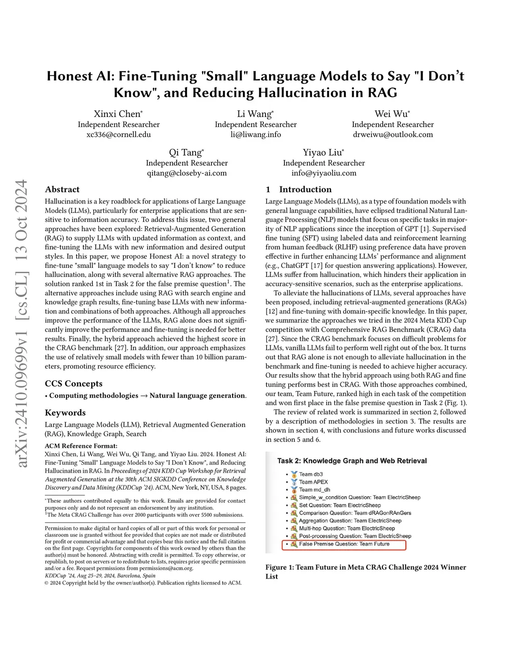 Hallucination is a key roadblock for applications of Large Language Models (LLMs), particularly for enterprise applications that are sensitive to information accuracy. To address this issue, two general approaches have been explored: Retrieval-Augmented Generation (RAG) to supply LLMs with updated information as context, and fine-tuning the LLMs with new information and desired output styles. In this paper, we propose Honest AI: a novel strategy to fine-tune "small" language models to say "I don't know" to reduce hallucination, along with several alternative RAG approaches. The solution ranked 1st in Task 2 for the false premise question. The alternative approaches include using RAG with search engine and knowledge graph results, fine-tuning base LLMs with new information and combinations of both approaches. Although all approaches improve the performance of the LLMs, RAG alone does not significantly improve the performance and fine-tuning is needed for better results. Finally, the hybrid approach achieved the highest score in the CRAG benchmark. In addition, our approach emphasizes the use of relatively small models with fewer than 10 billion parameters, promoting resource efficiency.