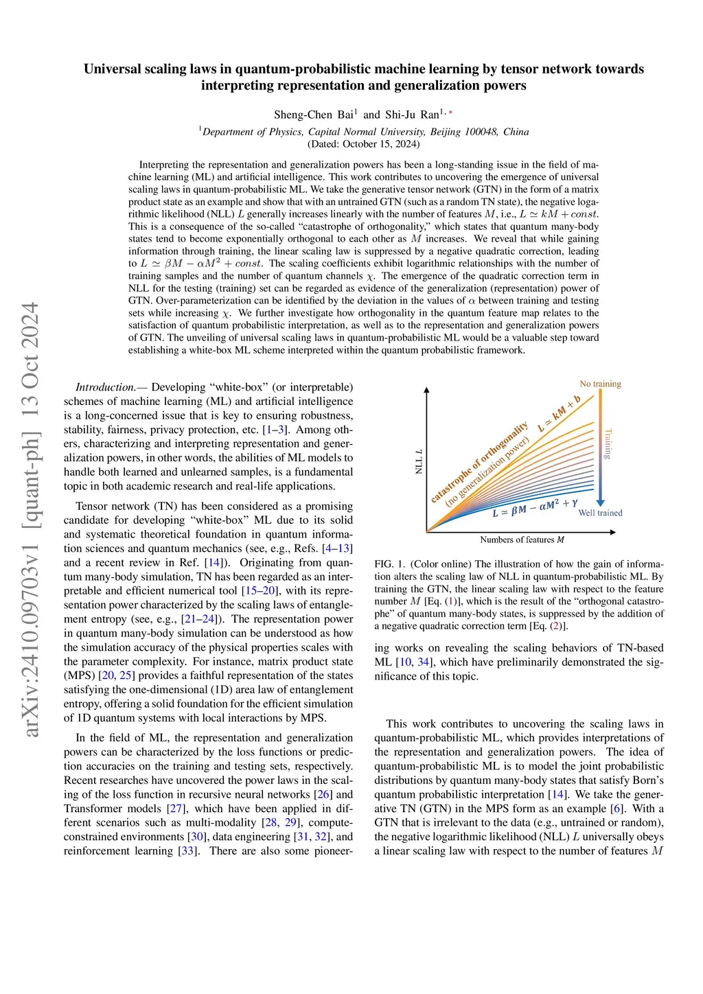 Interpreting the representation and generalization powers has been a long-standing issue in the field of machine learning (ML) and artificial intelligence. This work contributes to uncovering the emergence of universal scaling laws in quantum-probabilistic ML. We take the generative tensor network (GTN) in the form of a matrix product state as an example and show that with an untrained GTN (such as a random TN state), the negative logarithmic likelihood (NLL) generally increases linearly with the number of features , i.e., . This is a consequence of the so-called ``catastrophe of orthogonality,'' which states that quantum many-body states tend to become exponentially orthogonal to each other as increases. We reveal that while gaining information through training, the linear scaling law is suppressed by a negative quadratic correction, leading to . The scaling coefficients exhibit logarithmic relationships with the number of training samples and the number of quantum channels . The emergence of the quadratic correction term in NLL for the testing (training) set can be regarded as evidence of the generalization (representation) power of GTN. Over-parameterization can be identified by the deviation in the values of between training and testing sets while increasing . We further investigate how orthogonality in the quantum feature map relates to the satisfaction of quantum probabilistic interpretation, as well as to the representation and generalization powers of GTN. The unveiling of universal scaling laws in quantum-probabilistic ML would be a valuable step toward establishing a white-box ML scheme interpreted within the quantum probabilistic framework.
