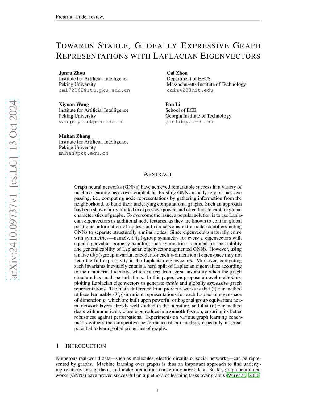 Graph neural networks (GNNs) have achieved remarkable success in a variety of machine learning tasks over graph data. Existing GNNs usually rely on message passing, i.e., computing node representations by gathering information from the neighborhood, to build their underlying computational graphs. They are known fairly limited in expressive power, and often fail to capture global characteristics of graphs. To overcome the issue, a popular solution is to use Laplacian eigenvectors as additional node features, as they contain global positional information of nodes, and can serve as extra node identifiers aiding GNNs to separate structurally similar nodes. For such an approach, properly handling the orthogonal group symmetry among eigenvectors with equal eigenvalue is crucial for its stability and generalizability. However, using a naive orthogonal group invariant encoder for each separate eigenspace may not keep the full expressivity in the Laplacian eigenvectors. Moreover, computing such invariants inevitably entails a hard split of Laplacian eigenvalues according to their numerical identity, which suffers from great instability when the graph structure is perturbed. In this paper, we propose a novel method exploiting Laplacian eigenvectors to generate stable and globally expressive graph representations. The main difference from previous works is that (i) our method utilizes learnable orthogonal group invariant representations for each Laplacian eigenspace, based upon powerful orthogonal group equivariant neural network layers already well studied in the literature, and that (ii) our method deals with numerically close eigenvalues in a smooth fashion, ensuring its better robustness against perturbations. Experiments on various graph learning benchmarks witness the competitive performance of our method, especially its great potential to learn global properties of graphs.