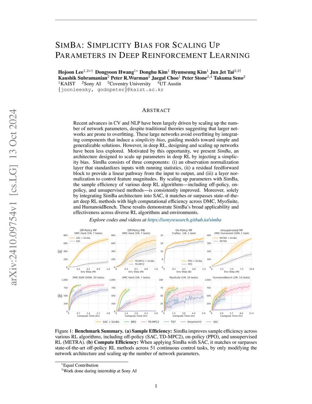 SimBa: Simplicity Bias for Scaling Up Parameters in Deep Reinforcement Learning
