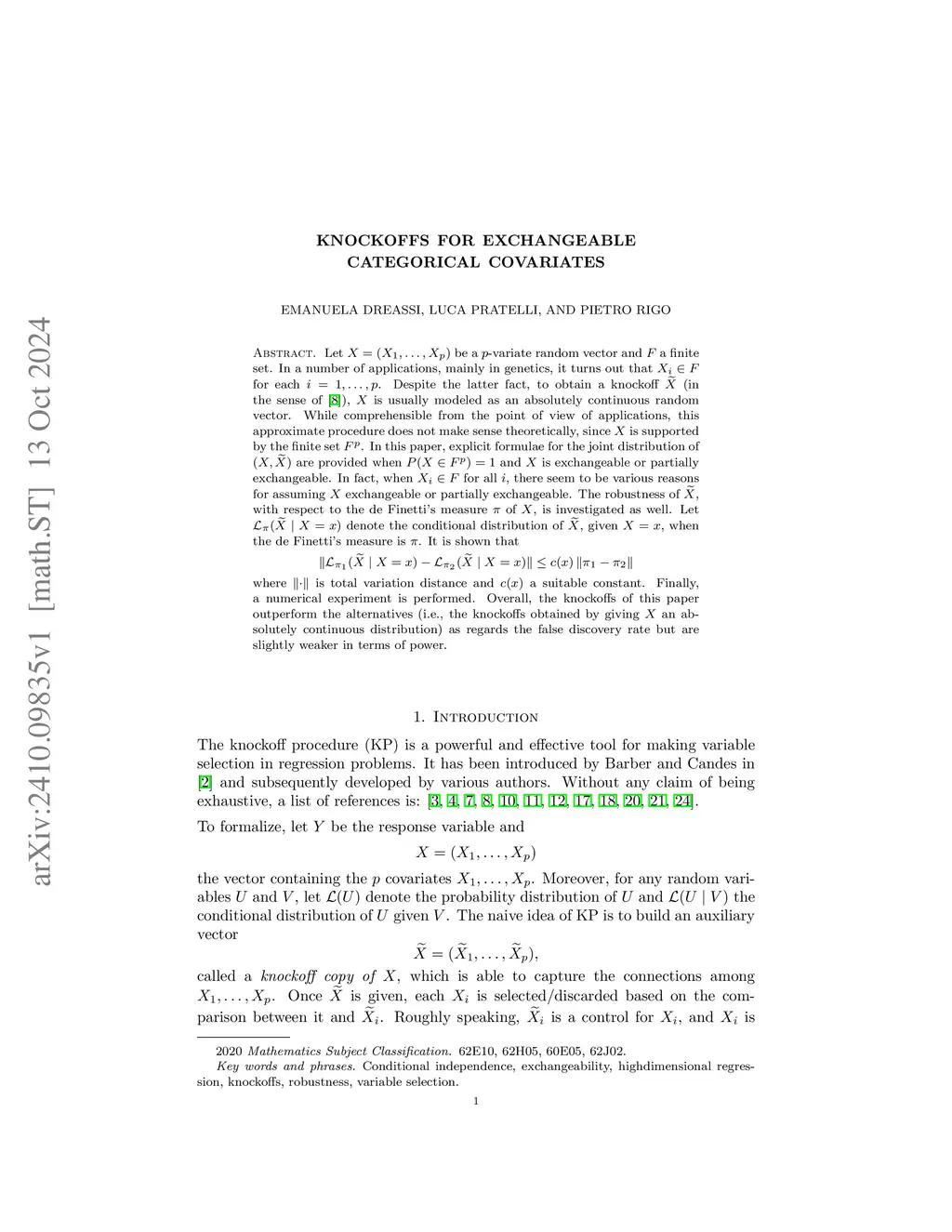 Let be a -variate random vector and a fixed finite set. In a number of applications, mainly in genetics, it turns out that for each . Despite the latter fact, to obtain a knockoff (in the sense of \cite{CFJL18}), is usually modeled as an absolutely continuous random vector. While comprehensible from the point of view of applications, this approximate procedure does not make sense theoretically, since is supported by the finite set . In this paper, explicit formulae for the joint distribution of are provided when and is exchangeable or partially exchangeable. In fact, when for all , there seem to be various reasons for assuming exchangeable or partially exchangeable. The robustness of , with respect to the de Finetti's measure of , is investigated as well. Let denote the conditional distribution of , given , when the de Finetti's measure is . It is shown that where is total variation distance and a suitable constant. Finally, a numerical experiment is performed. Overall, the knockoffs of this paper outperform the alternatives (i.e., the knockoffs obtained by giving an absolutely continuous distribution) as regards the false discovery rate but are slightly weaker in terms of power.