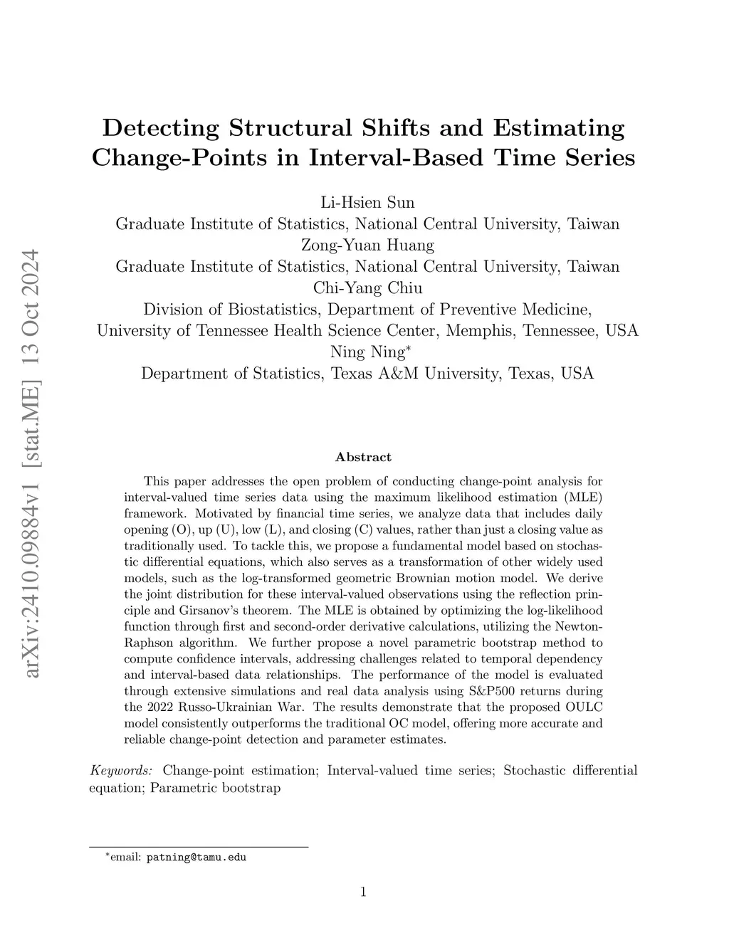 This paper addresses the open problem of conducting change-point analysis for interval-valued time series data using the maximum likelihood estimation (MLE) framework. Motivated by financial time series, we analyze data that includes daily opening (O), up (U), low (L), and closing (C) values, rather than just a closing value as traditionally used. To tackle this, we propose a fundamental model based on stochastic differential equations, which also serves as a transformation of other widely used models, such as the log-transformed geometric Brownian motion model. We derive the joint distribution for these interval-valued observations using the reflection principle and Girsanov's theorem. The MLE is obtained by optimizing the log-likelihood function through first and second-order derivative calculations, utilizing the Newton-Raphson algorithm. We further propose a novel parametric bootstrap method to compute confidence intervals, addressing challenges related to temporal dependency and interval-based data relationships. The performance of the model is evaluated through extensive simulations and real data analysis using S&P500 returns during the 2022 Russo-Ukrainian War. The results demonstrate that the proposed OULC model consistently outperforms the traditional OC model, offering more accurate and reliable change-point detection and parameter estimates.