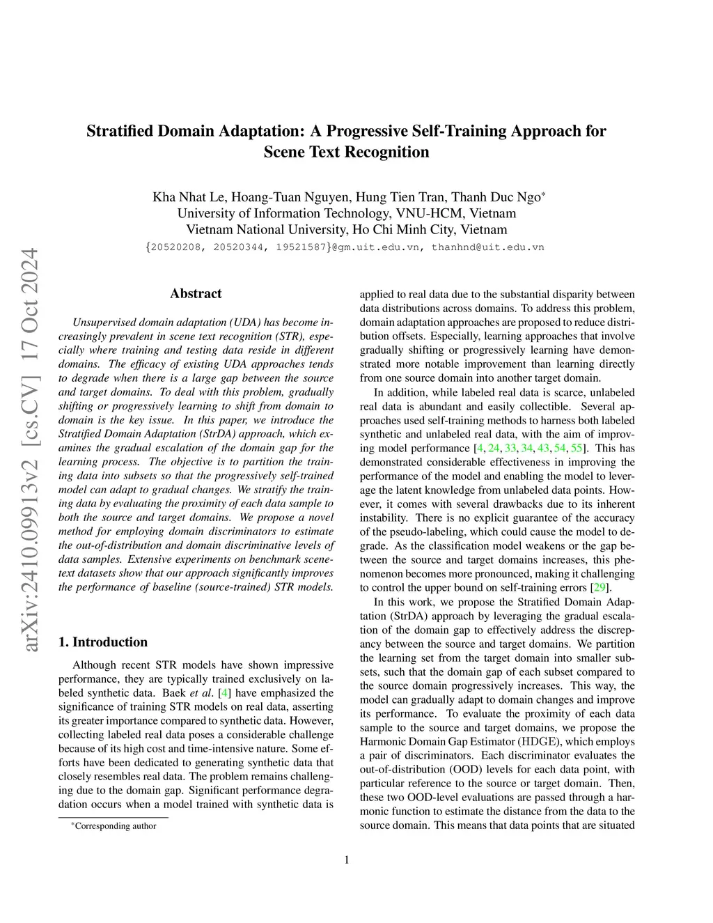 Unsupervised domain adaptation (UDA) has become increasingly prevalent in scene text recognition (STR), especially where training and testing data reside in different domains. The efficacy of existing UDA approaches tends to degrade when there is a large gap between the source and target domains. To deal with this problem, gradually shifting or progressively learning to shift from domain to domain is the key issue. In this paper, we introduce the Stratified Domain Adaptation (StrDA) approach, which examines the gradual escalation of the domain gap for the learning process. The objective is to partition the training data into subsets so that the progressively self-trained model can adapt to gradual changes. We stratify the training data by evaluating the proximity of each data sample to both the source and target domains. We propose a novel method for employing domain discriminators to estimate the out-of-distribution and domain discriminative levels of data samples. Extensive experiments on benchmark scene-text datasets show that our approach significantly improves the performance of baseline (source-trained) STR models.
