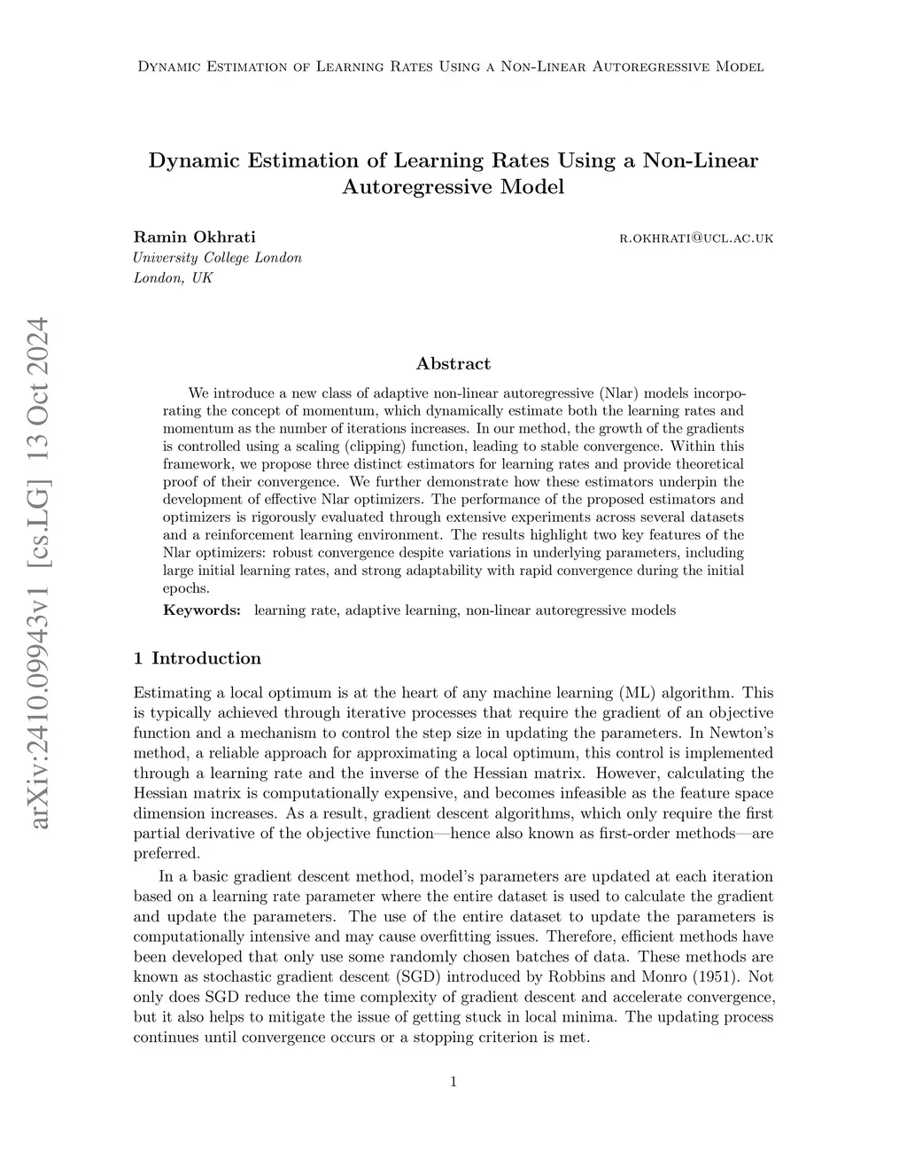 We introduce a new class of adaptive non-linear autoregressive (Nlar) models incorporating the concept of momentum, which dynamically estimate both the learning rates and momentum as the number of iterations increases. In our method, the growth of the gradients is controlled using a scaling (clipping) function, leading to stable convergence. Within this framework, we propose three distinct estimators for learning rates and provide theoretical proof of their convergence. We further demonstrate how these estimators underpin the development of effective Nlar optimizers. The performance of the proposed estimators and optimizers is rigorously evaluated through extensive experiments across several datasets and a reinforcement learning environment. The results highlight two key features of the Nlar optimizers: robust convergence despite variations in underlying parameters, including large initial learning rates, and strong adaptability with rapid convergence during the initial epochs.