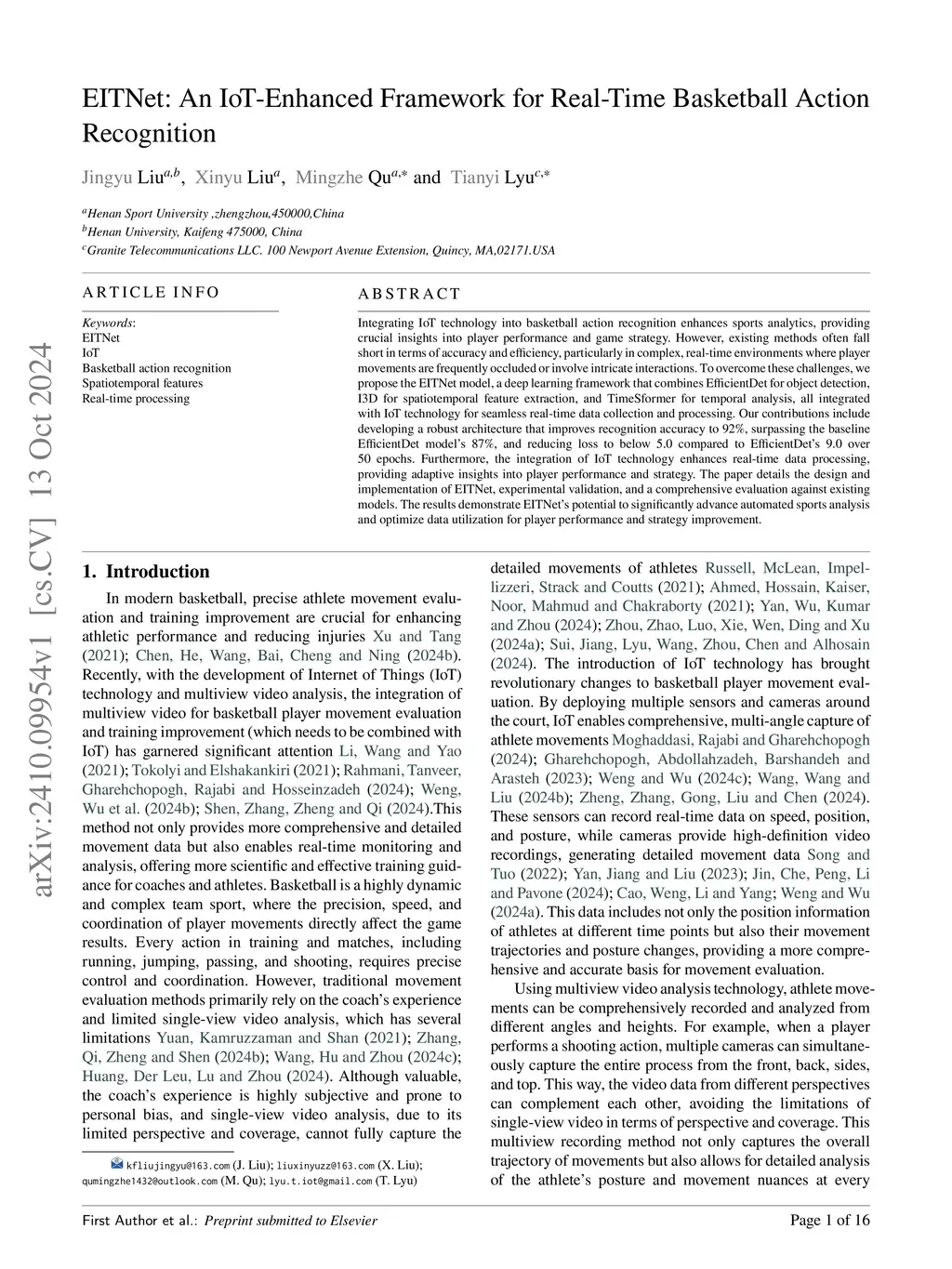 Integrating IoT technology into basketball action recognition enhances sports analytics, providing crucial insights into player performance and game strategy. However, existing methods often fall short in terms of accuracy and efficiency, particularly in complex, real-time environments where player movements are frequently occluded or involve intricate interactions. To overcome these challenges, we propose the EITNet model, a deep learning framework that combines EfficientDet for object detection, I3D for spatiotemporal feature extraction, and TimeSformer for temporal analysis, all integrated with IoT technology for seamless real-time data collection and processing. Our contributions include developing a robust architecture that improves recognition accuracy to 92\%, surpassing the baseline EfficientDet model's 87\%, and reducing loss to below 5.0 compared to EfficientDet's 9.0 over 50 epochs. Furthermore, the integration of IoT technology enhances real-time data processing, providing adaptive insights into player performance and strategy. The paper details the design and implementation of EITNet, experimental validation, and a comprehensive evaluation against existing models. The results demonstrate EITNet's potential to significantly advance automated sports analysis and optimize data utilization for player performance and strategy improvement.
