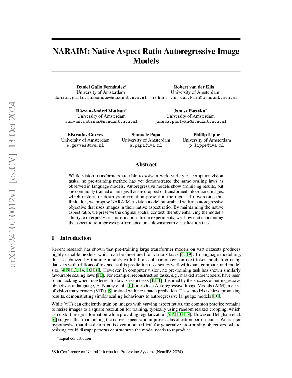 While vision transformers are able to solve a wide variety of computer vision tasks, no pre-training method has yet demonstrated the same scaling laws as observed in language models. Autoregressive models show promising results, but are commonly trained on images that are cropped or transformed into square images, which distorts or destroys information present in the input. To overcome this limitation, we propose NARAIM, a vision model pre-trained with an autoregressive objective that uses images in their native aspect ratio. By maintaining the native aspect ratio, we preserve the original spatial context, thereby enhancing the model's ability to interpret visual information. In our experiments, we show that maintaining the aspect ratio improves performance on a downstream classification task.