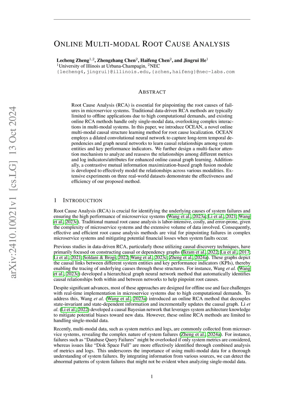 Root Cause Analysis (RCA) is essential for pinpointing the root causes of failures in microservice systems. Traditional data-driven RCA methods are typically limited to offline applications due to high computational demands, and existing online RCA methods handle only single-modal data, overlooking complex interactions in multi-modal systems. In this paper, we introduce OCEAN, a novel online multi-modal causal structure learning method for root cause localization. OCEAN employs a dilated convolutional neural network to capture long-term temporal dependencies and graph neural networks to learn causal relationships among system entities and key performance indicators. We further design a multi-factor attention mechanism to analyze and reassess the relationships among different metrics and log indicators/attributes for enhanced online causal graph learning. Additionally, a contrastive mutual information maximization-based graph fusion module is developed to effectively model the relationships across various modalities. Extensive experiments on three real-world datasets demonstrate the effectiveness and efficiency of our proposed method.