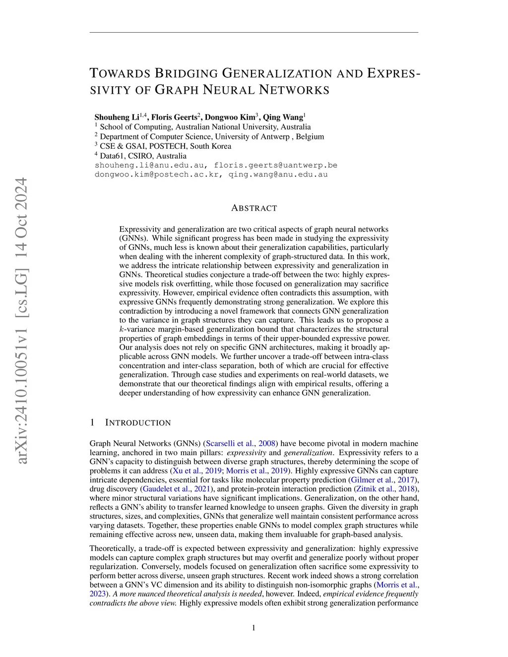 Expressivity and generalization are two critical aspects of graph neural networks (GNNs). While significant progress has been made in studying the expressivity of GNNs, much less is known about their generalization capabilities, particularly when dealing with the inherent complexity of graph-structured data. In this work, we address the intricate relationship between expressivity and generalization in GNNs. Theoretical studies conjecture a trade-off between the two: highly expressive models risk overfitting, while those focused on generalization may sacrifice expressivity. However, empirical evidence often contradicts this assumption, with expressive GNNs frequently demonstrating strong generalization. We explore this contradiction by introducing a novel framework that connects GNN generalization to the variance in graph structures they can capture. This leads us to propose a -variance margin-based generalization bound that characterizes the structural properties of graph embeddings in terms of their upper-bounded expressive power. Our analysis does not rely on specific GNN architectures, making it broadly applicable across GNN models. We further uncover a trade-off between intra-class concentration and inter-class separation, both of which are crucial for effective generalization. Through case studies and experiments on real-world datasets, we demonstrate that our theoretical findings align with empirical results, offering a deeper understanding of how expressivity can enhance GNN generalization.