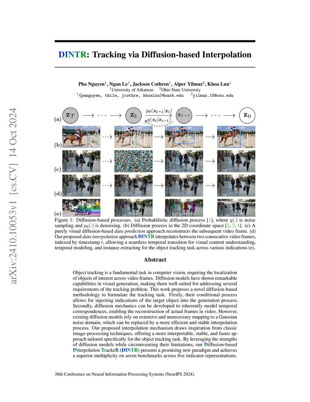 Object tracking is a fundamental task in computer vision, requiring the localization of objects of interest across video frames. Diffusion models have shown remarkable capabilities in visual generation, making them well-suited for addressing several requirements of the tracking problem. This work proposes a novel diffusion-based methodology to formulate the tracking task. Firstly, their conditional process allows for injecting indications of the target object into the generation process. Secondly, diffusion mechanics can be developed to inherently model temporal correspondences, enabling the reconstruction of actual frames in video. However, existing diffusion models rely on extensive and unnecessary mapping to a Gaussian noise domain, which can be replaced by a more efficient and stable interpolation process. Our proposed interpolation mechanism draws inspiration from classic image-processing techniques, offering a more interpretable, stable, and faster approach tailored specifically for the object tracking task. By leveraging the strengths of diffusion models while circumventing their limitations, our Diffusion-based INterpolation TrackeR (DINTR) presents a promising new paradigm and achieves a superior multiplicity on seven benchmarks across five indicator representations.