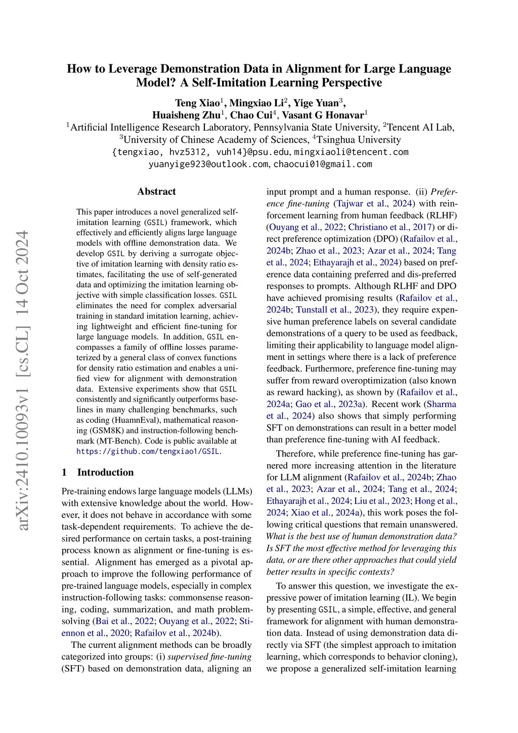 This paper introduces a novel generalized self-imitation learning () framework, which effectively and efficiently aligns large language models with offline demonstration data. We develop by deriving a surrogate objective of imitation learning with density ratio estimates, facilitating the use of self-generated data and optimizing the imitation learning objective with simple classification losses. eliminates the need for complex adversarial training in standard imitation learning, achieving lightweight and efficient fine-tuning for large language models. In addition, encompasses a family of offline losses parameterized by a general class of convex functions for density ratio estimation and enables a unified view for alignment with demonstration data. Extensive experiments show that consistently and significantly outperforms baselines in many challenging benchmarks, such as coding (HuamnEval), mathematical reasoning (GSM8K) and instruction-following benchmark (MT-Bench).