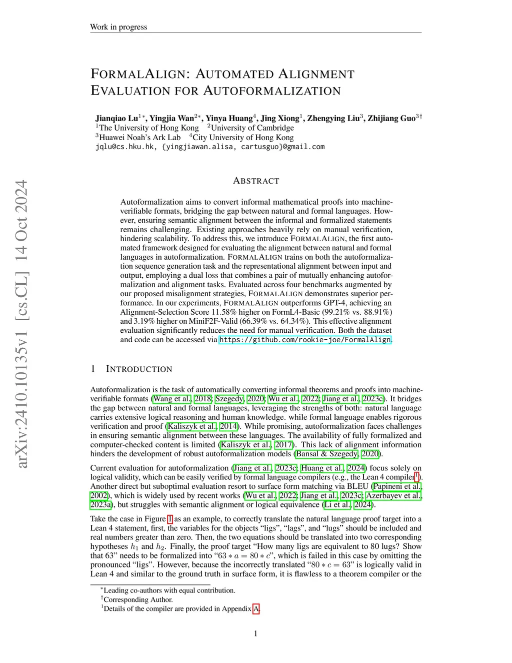 Autoformalization aims to convert informal mathematical proofs into machine-verifiable formats, bridging the gap between natural and formal languages. However, ensuring semantic alignment between the informal and formalized statements remains challenging. Existing approaches heavily rely on manual verification, hindering scalability. To address this, we introduce \textsc{FormalAlign}, the first automated framework designed for evaluating the alignment between natural and formal languages in autoformalization. \textsc{FormalAlign} trains on both the autoformalization sequence generation task and the representational alignment between input and output, employing a dual loss that combines a pair of mutually enhancing autoformalization and alignment tasks. Evaluated across four benchmarks augmented by our proposed misalignment strategies, \textsc{FormalAlign} demonstrates superior performance. In our experiments, \textsc{FormalAlign} outperforms GPT-4, achieving an Alignment-Selection Score 11.58\% higher on \forml-Basic (99.21\% vs. 88.91\%) and 3.19\% higher on MiniF2F-Valid (66.39\% vs. 64.34\%). This effective alignment evaluation significantly reduces the need for manual verification. Both the dataset and code can be accessed via~\url{https://github.com/rookie-joe/FormalAlign}.