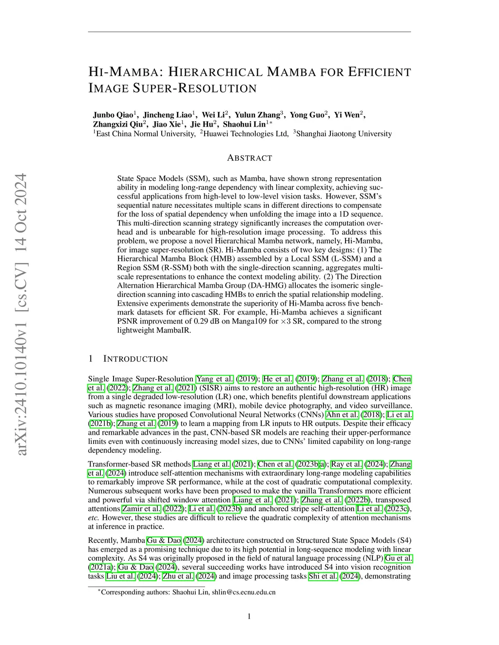 State Space Models (SSM), such as Mamba, have shown strong representation ability in modeling long-range dependency with linear complexity, achieving successful applications from high-level to low-level vision tasks. However, SSM's sequential nature necessitates multiple scans in different directions to compensate for the loss of spatial dependency when unfolding the image into a 1D sequence. This multi-direction scanning strategy significantly increases the computation overhead and is unbearable for high-resolution image processing. To address this problem, we propose a novel Hierarchical Mamba network, namely, Hi-Mamba, for image super-resolution (SR). Hi-Mamba consists of two key designs: (1) The Hierarchical Mamba Block (HMB) assembled by a Local SSM (L-SSM) and a Region SSM (R-SSM) both with the single-direction scanning, aggregates multi-scale representations to enhance the context modeling ability. (2) The Direction Alternation Hierarchical Mamba Group (DA-HMG) allocates the isomeric single-direction scanning into cascading HMBs to enrich the spatial relationship modeling. Extensive experiments demonstrate the superiority of Hi-Mamba across five benchmark datasets for efficient SR. For example, Hi-Mamba achieves a significant PSNR improvement of 0.29 dB on Manga109 for SR, compared to the strong lightweight MambaIR.