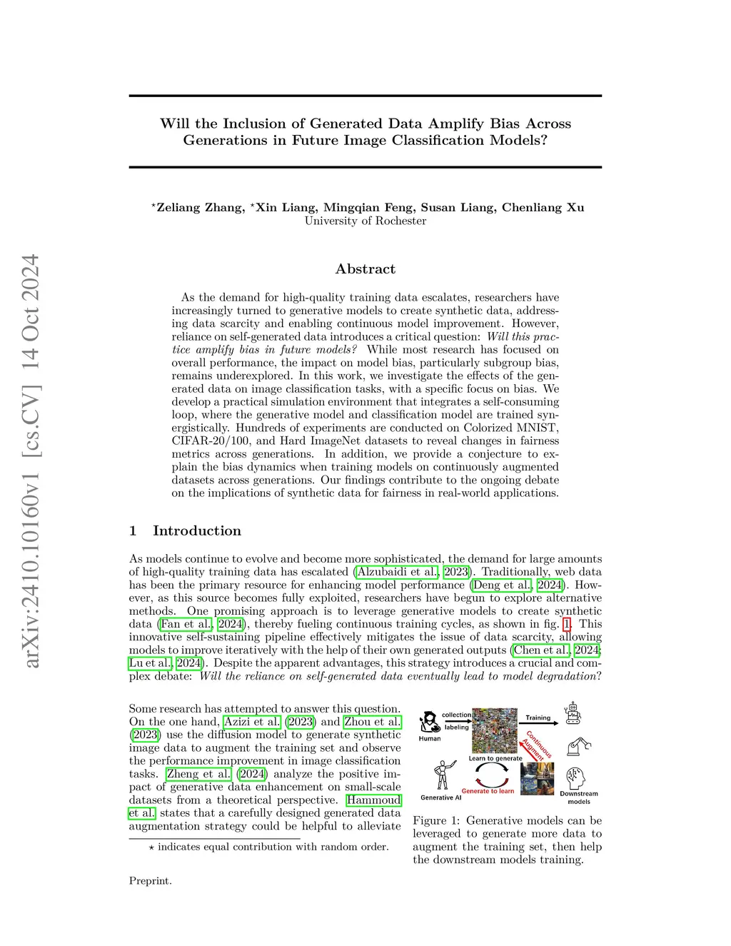 As the demand for high-quality training data escalates, researchers have increasingly turned to generative models to create synthetic data, addressing data scarcity and enabling continuous model improvement. However, reliance on self-generated data introduces a critical question: Will this practice amplify bias in future models? While most research has focused on overall performance, the impact on model bias, particularly subgroup bias, remains underexplored. In this work, we investigate the effects of the generated data on image classification tasks, with a specific focus on bias. We develop a practical simulation environment that integrates a self-consuming loop, where the generative model and classification model are trained synergistically. Hundreds of experiments are conducted on Colorized MNIST, CIFAR-20/100, and Hard ImageNet datasets to reveal changes in fairness metrics across generations. In addition, we provide a conjecture to explain the bias dynamics when training models on continuously augmented datasets across generations. Our findings contribute to the ongoing debate on the implications of synthetic data for fairness in real-world applications.