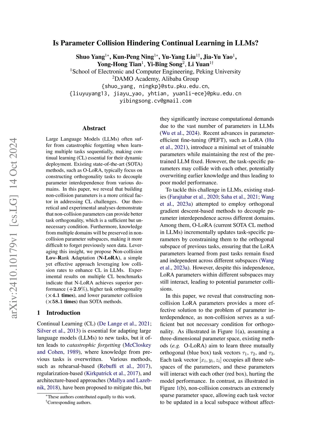 Large Language Models (LLMs) often suffer from catastrophic forgetting when learning multiple tasks sequentially, making continual learning (CL) essential for their dynamic deployment. Existing state-of-the-art (SOTA) methods, such as O-LoRA, typically focus on constructing orthogonality tasks to decouple parameter interdependence from various domains.In this paper, we reveal that building non-collision parameters is a more critical factor in addressing CL challenges. Our theoretical and experimental analyses demonstrate that non-collision parameters can provide better task orthogonality, which is a sufficient but unnecessary condition. Furthermore, knowledge from multiple domains will be preserved in non-collision parameter subspaces, making it more difficult to forget previously seen data. Leveraging this insight, we propose Non-collision Low-Rank Adaptation (N-LoRA), a simple yet effective approach leveraging low collision rates to enhance CL in LLMs. Experimental results on multiple CL benchmarks indicate that N-LoRA achieves superior performance (+2.9), higher task orthogonality (*4.1 times), and lower parameter collision (*58.1 times) than SOTA methods.