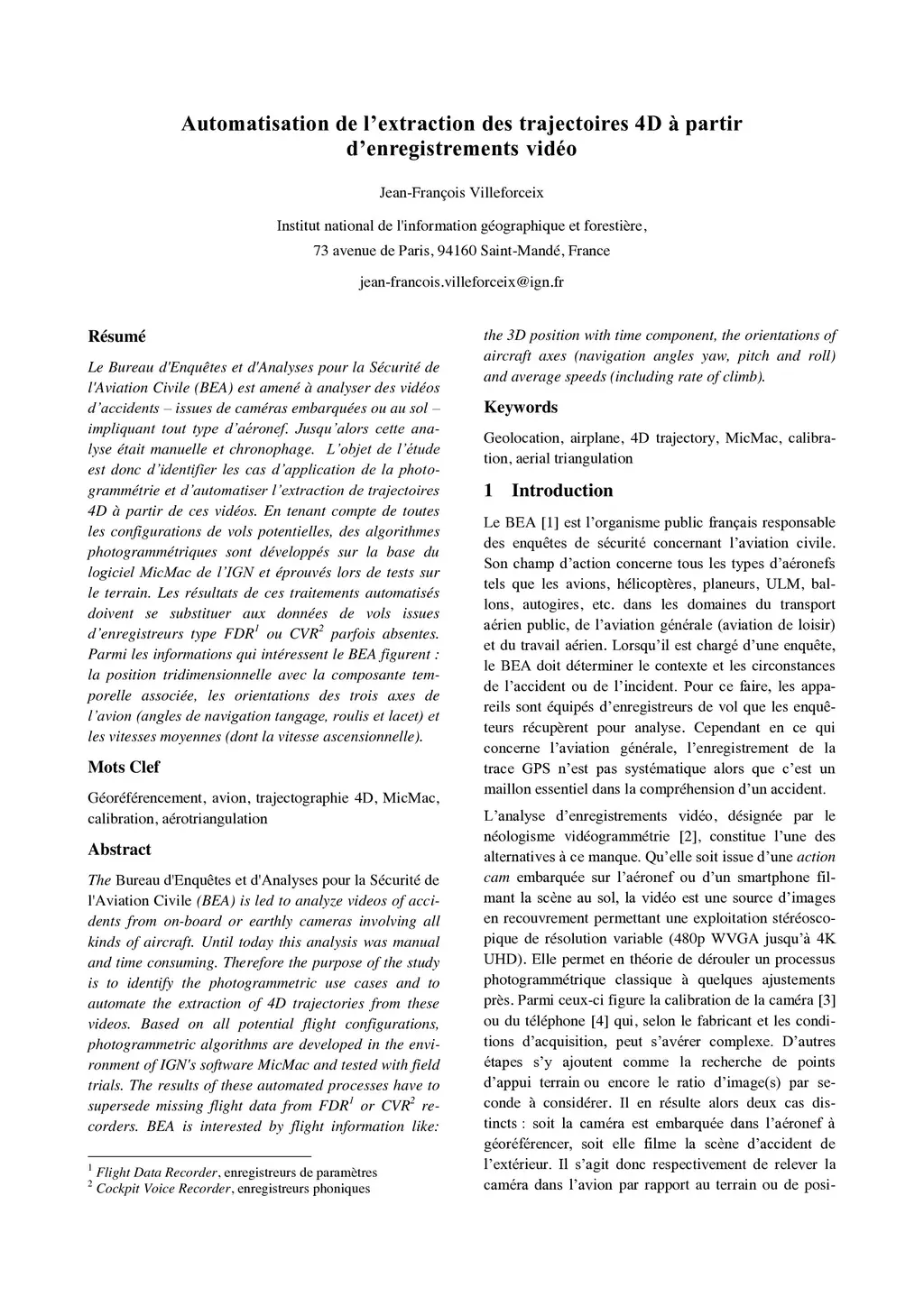 The Bureau dÉnqu{\^e}tes et dÁnalyses pour la S{\é}curit{\é} de lÁviation Civile (BEA) has to analyze accident videos from on-board or ground cameras involving all types of aircraft. Until now, this analysis has been manual and time-consuming. The aim of this study is to identify the applications of photogrammetry and to automate the extraction of 4D trajectories from these videos. Taking into account all potential flight configurations, photogrammetric algorithms are being developed on the basis of IGN's MicMac software and tested in the field. The results of these automated processes are intended to replace flight data from recorders such as FDRs or CVRs, which are sometimes missing. The information of interest to the BEA includes: three-dimensional position with the associated time component, the orientations of the aircraft's three axes (pitch, roll and yaw navigation angles) and average speeds (including rate of climb).